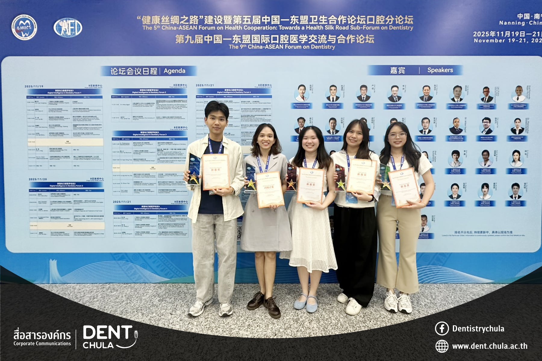 The Faculty of Dentistry, Chulalongkorn University, extends its heartfelt congratulations to our students who earned prestigious awards at the 5th China-ASEAN Forum on Health Cooperation: Towards a Health Silk Road – Sub-Forum on Dentistry and the 9th China-ASEAN Forum on Dentistry, held from 19-21 November 2025 in Nanning, China: