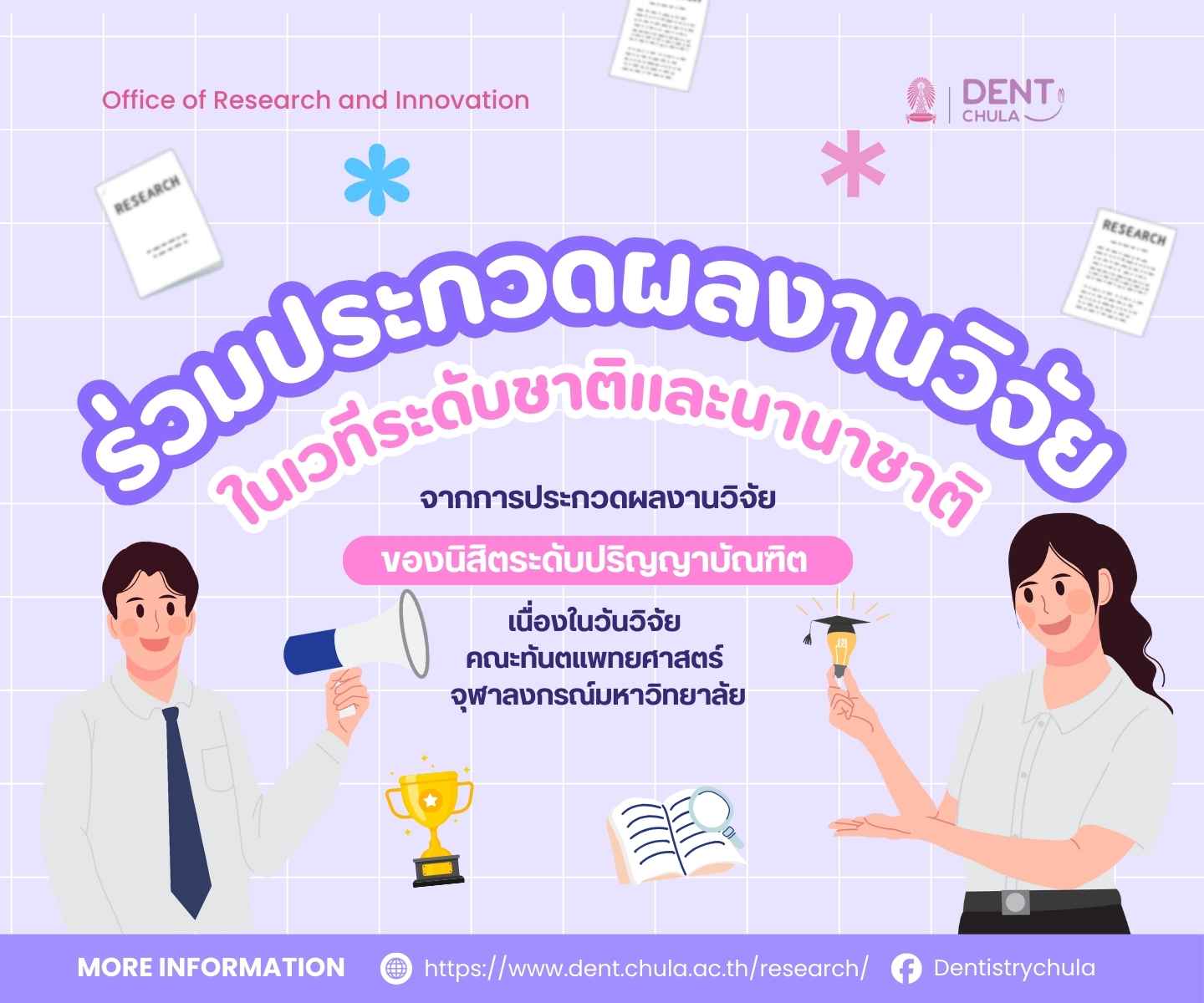The Faculty of Dentistry, Chulalongkorn University, invites undergraduate students to submit their research for consideration to represent the faculty in national and international research competitions. The selection will be based on research presentations from the faculty’s annual Research Day.