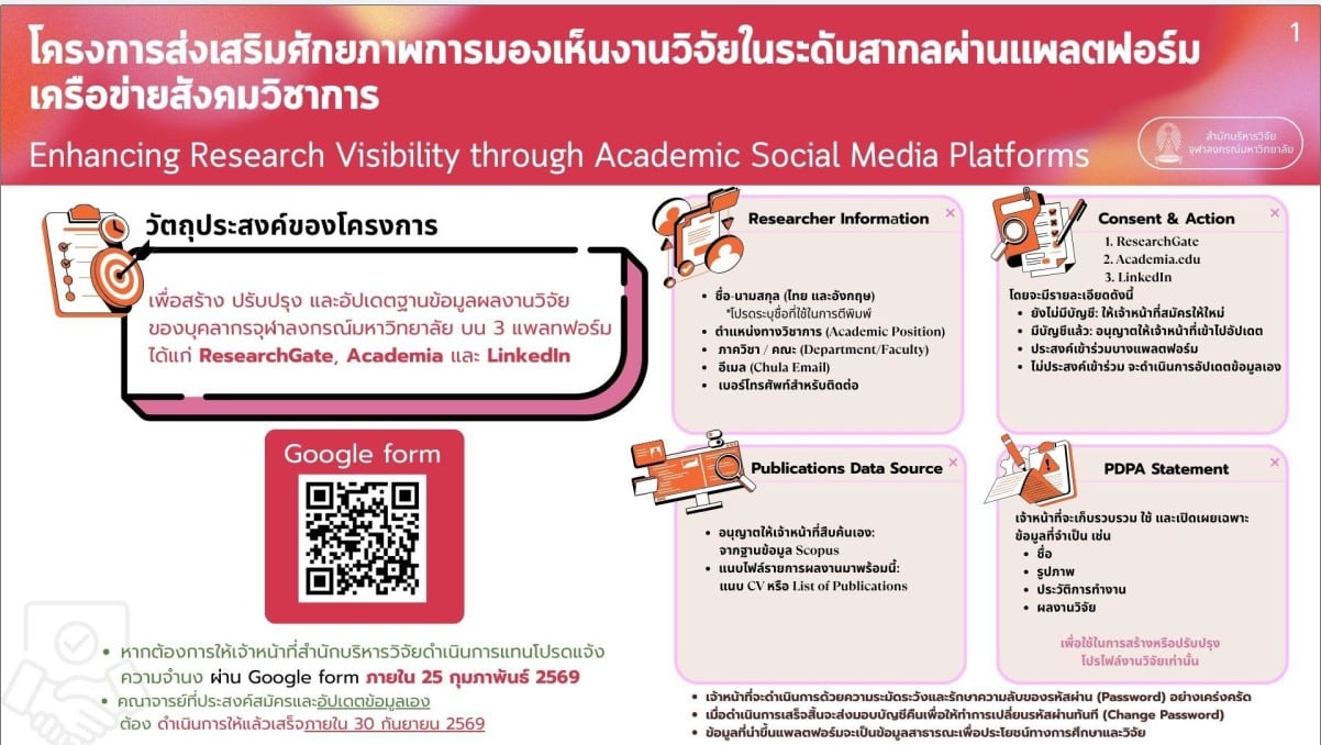 Chulalongkorn University places great importance on encouraging all faculty members to maintain user accounts on Academic and Professional Social Media platforms, with the aim of having complete profiles across all three key platforms: ResearchGate, Academia, and LinkedIn.