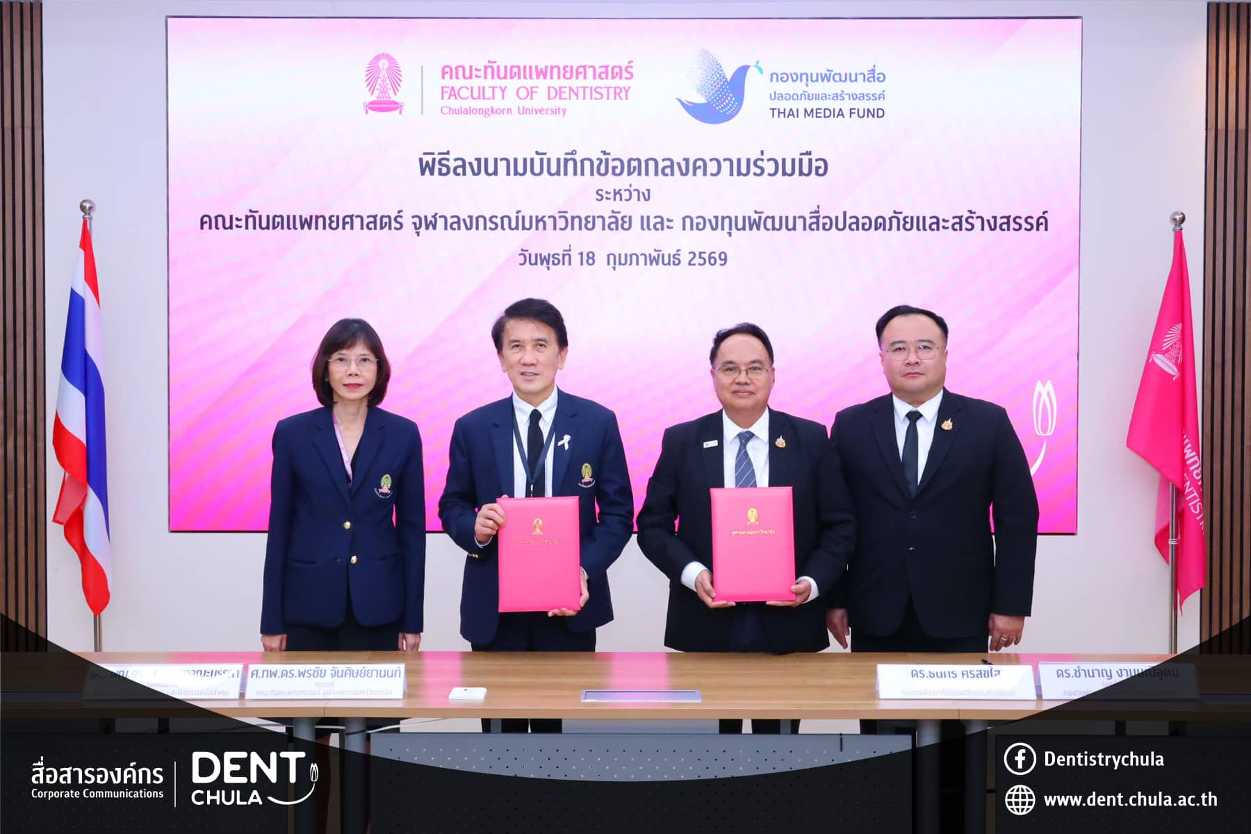 The Faculty of Dentistry, Chulalongkorn University hosted a Memorandum of Understanding (MoU) signing ceremony with the Thai Media Fund (Safe and Creative Media Development Fund) to jointly develop and produce safe, creative media on dentistry and oral health care. The MoU was signed by Professor Dr. Pornchai Jansisyanont, Dean of the Faculty of Dentistry, Chulalongkorn University, and Associate Professor Dr. Rangsima Sakoolnamarka, Vice Dean for International Affairs, Corporate Communications, and Social Engagement, together with Dr. Thanakorn Srisuksai, Manager of the Thai Media Fund, and Dr. Chamnan Ngammaneeudom, Deputy Manager of the Thai Media Fund, with senior executives and honored guests in attendance as witnesses.