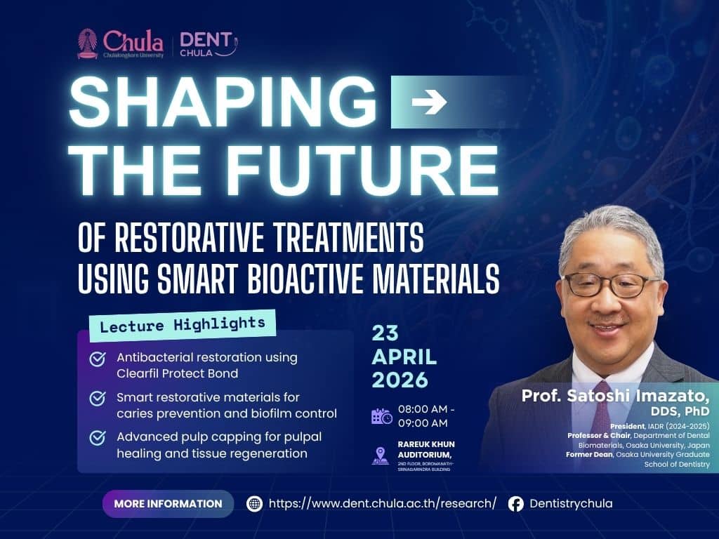 Faculty of Dentistry, Chulalongkorn University, cordially invites faculty members, researchers, students, and interested participants to attend a special lecture on “Shaping the Future of Restorative Treatments Using Smart Bioactive Materials.”