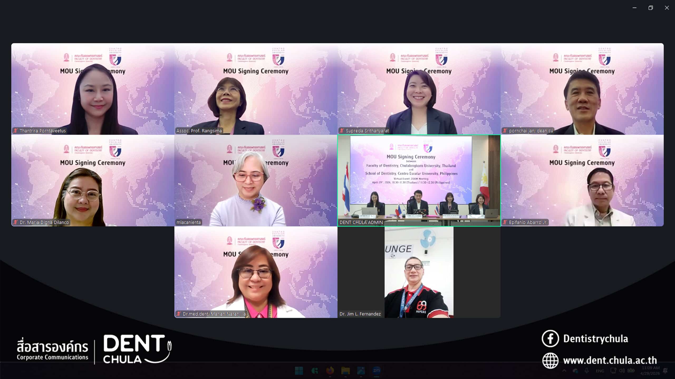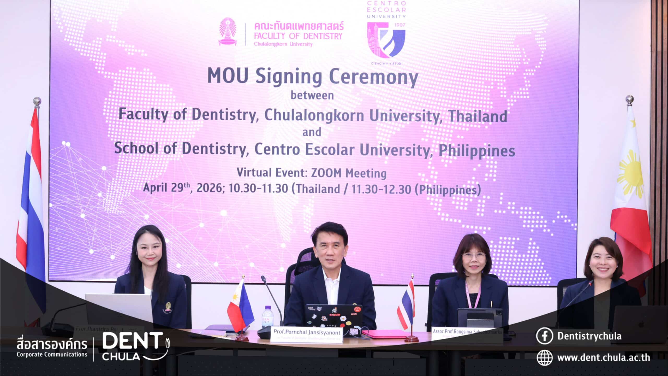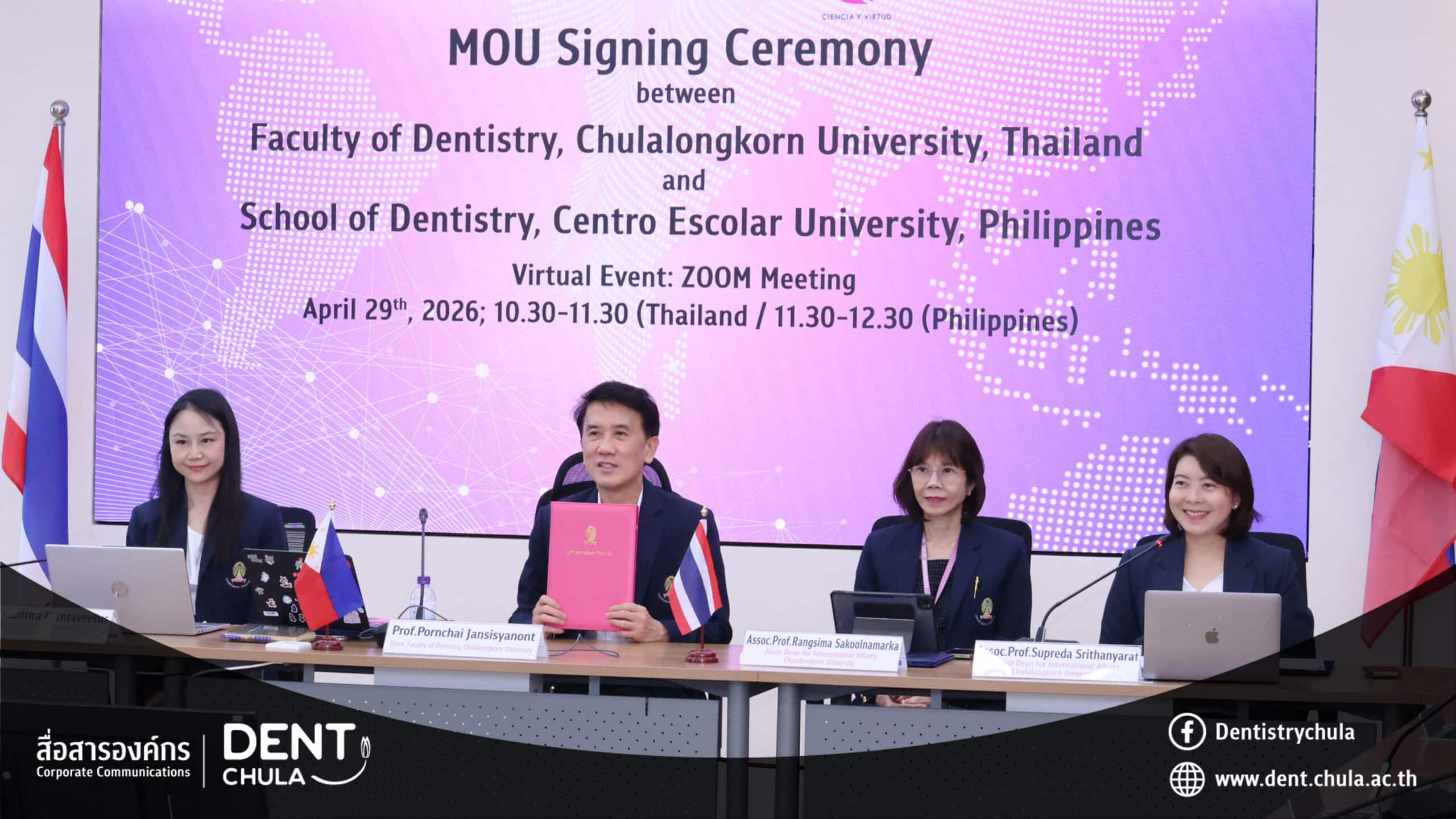 The Faculty of Dentistry, Chulalongkorn University, led by Professor Pornchai Jansisyanont, Dean, signed a Memorandum of Understanding (MOU) with the School of Dentistry, Centro Escolar University, Philippines, via a virtual Zoom meeting.