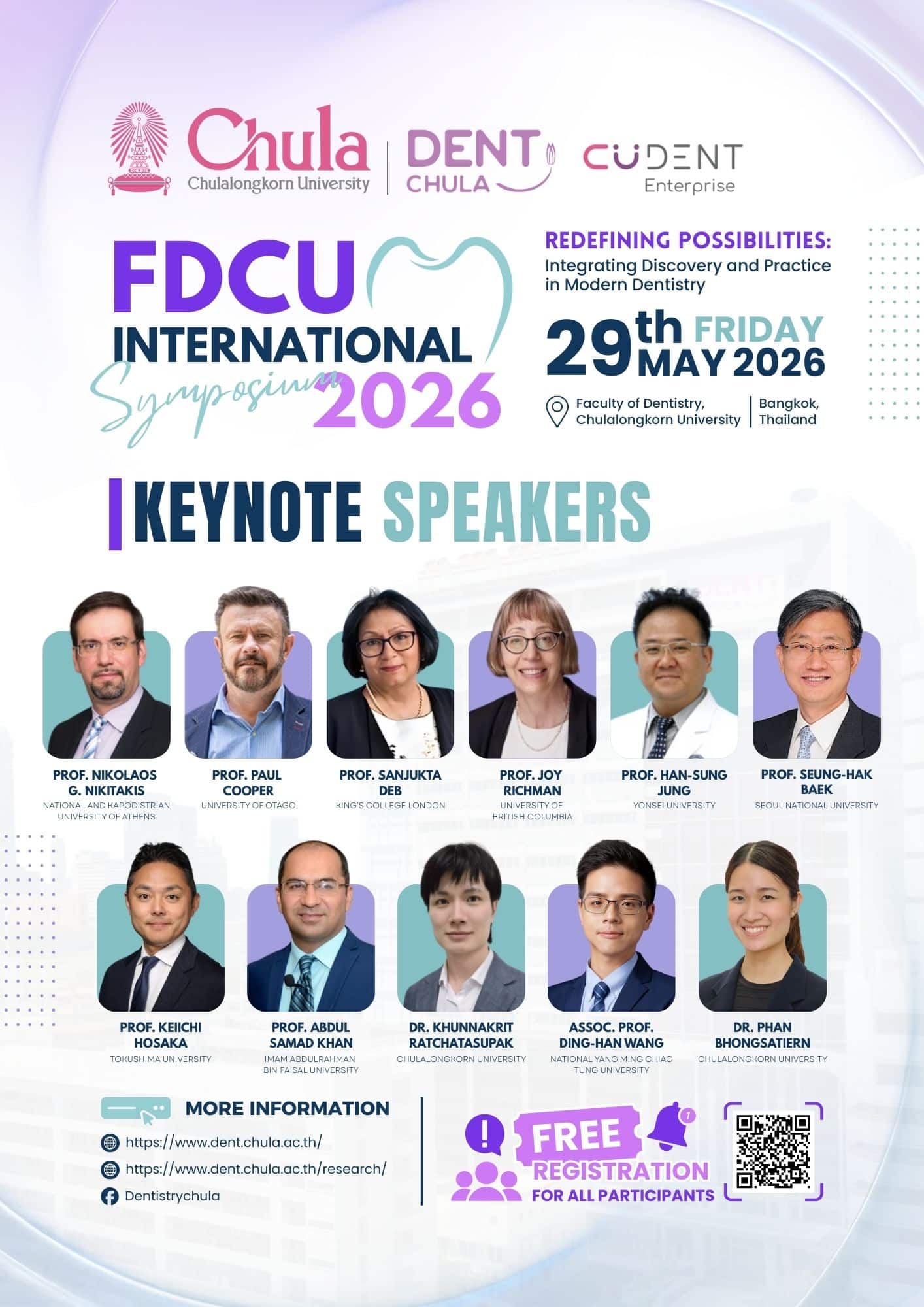 The Faculty of Dentistry, Chulalongkorn University (FDCU), is delighted to announce the FDCU International Symposium 2026, which will be held onsite on May 29th, 2026, at the Faculty of Dentistry, Chulalongkorn University, Bangkok.