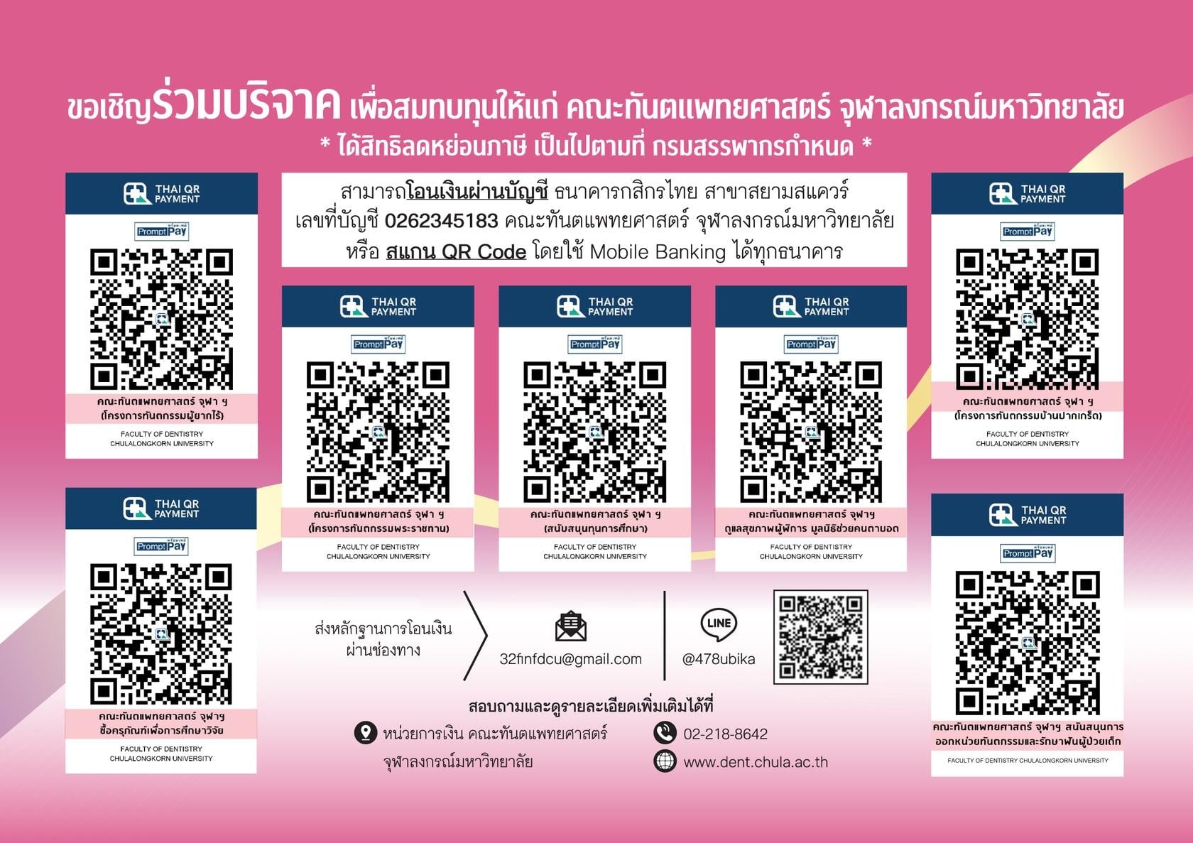 ขอเชิญร่วมบริจาค เพื่อสมทบทุนให้แก่ คณะทันตแพทยศาสตร์ จุฬาลงกรณ์มหาวิทยาลัย ได้สิทธิลดหย่อนภาษี เป็นไปตามที่ กรมสรรพากรกำหนด