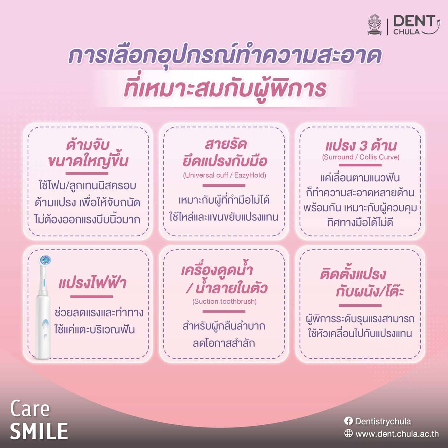 เพื่อให้ผู้พิการสามารถแปรงฟันได้ง่ายขึ้น สามารถเลือกใช้อุปกรณ์ให้เหมาะกับความสามารถที่เหลืออยู่ของแขนและมือ เช่น