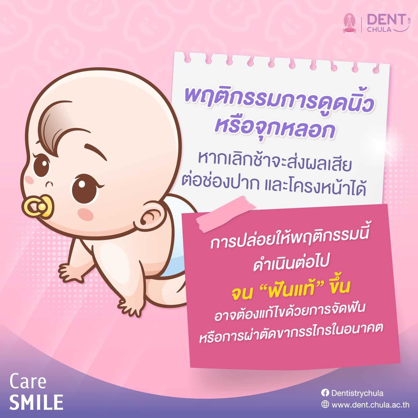 พฤติกรรมการดูดนิ้วหรือจุกหลอกหากเลิกได้ช้าจะส่งผลเสียต่อช่องปากและโครงหน้าได้