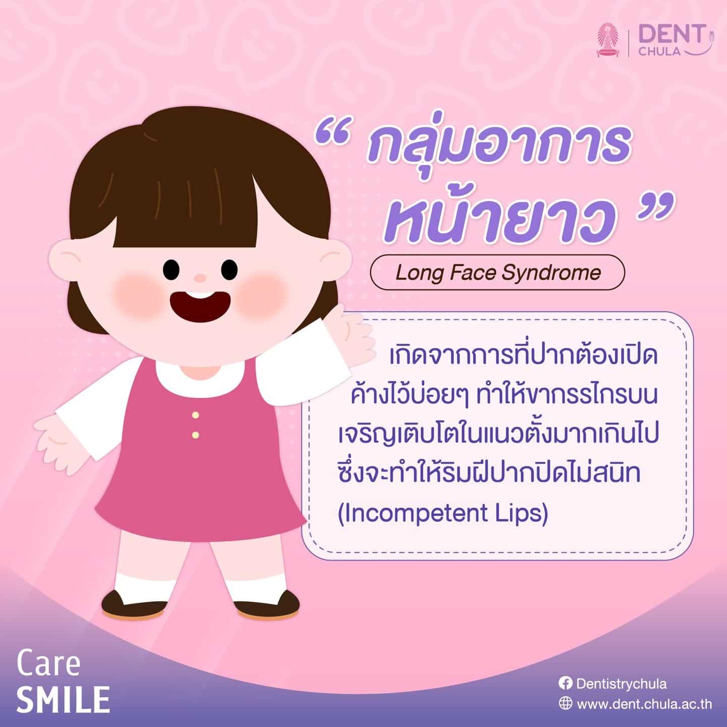 - กลุ่มอาการหน้ายาว (Long Face Syndrome): เกิดจากการที่ปากต้องเปิดค้างไว้บ่อยๆ ทำให้ขากรรไกรบนเจริญเติบโตในแนวตั้งมากเกินไป ซึ่งจะทำให้ริมฝีปากปิดไม่สนิท (Incompetent Lips)