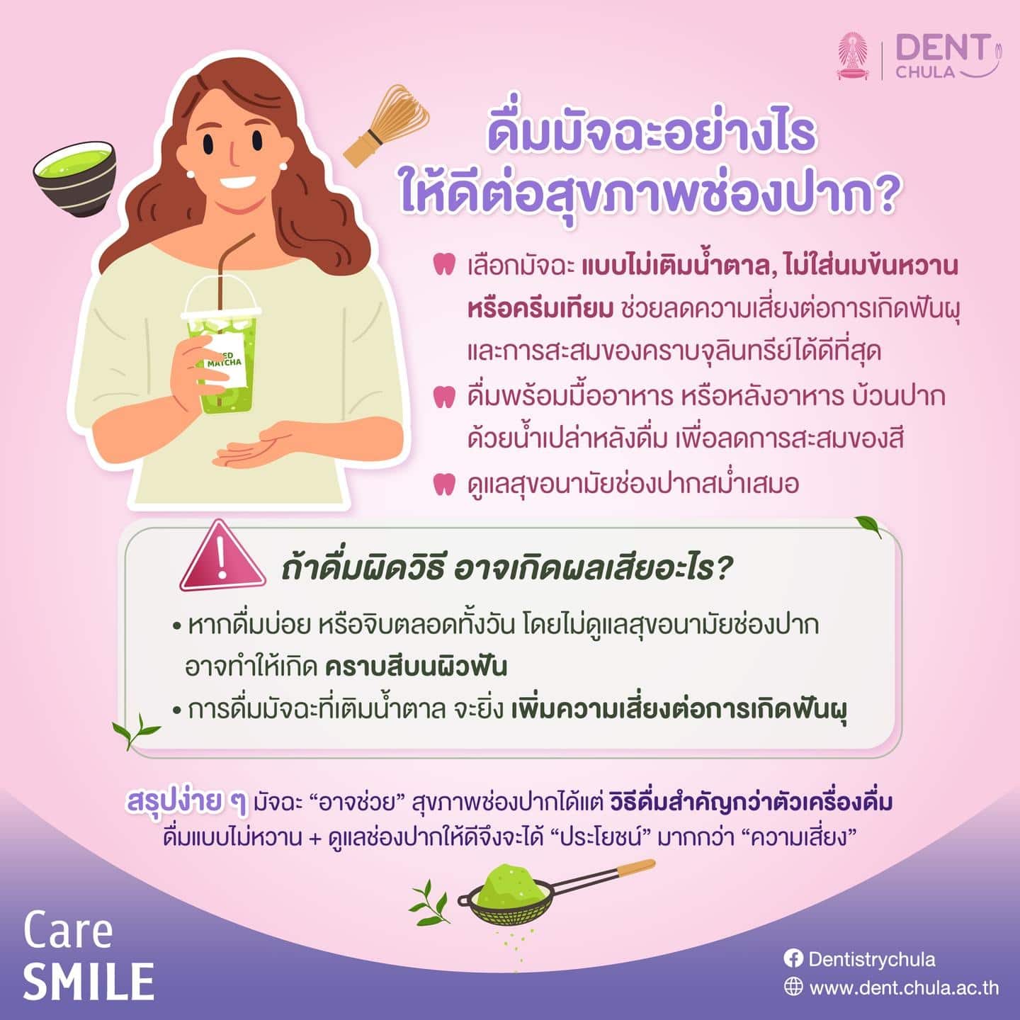 นอกจากนี้ ประโยชน์ต่อสุขภาพช่องปากจะเกิดขึ้นได้ก็ต่อเมื่อเลือกดื่มมัจฉะอย่าง “เหมาะสม” การดื่มมัจฉะแบบไม่เติมน้ำตาล นม หรือครีมเทียม จะช่วยลดความเสี่ยงต่อการเกิดฟันผุและการสะสมของคราบจุลินทรีย์ได้ดีที่สุด และควรดื่มในช่วงมื้ออาหารหรือหลังอาหาร บ้วนปากด้วยน้ำเปล่าหลังดื่ม เพื่อลดการสะสมของสี หากดื่มบ่อยหรือจิบตลอดทั้งวันโดยไม่ดูแลสุขอนามัยช่องปาก อาจทำให้เกิดคราบสีบนผิวฟันได้ และในกรณีที่ดื่มมัจฉะที่มีการเติมน้ำตาล จะยิ่งเพิ่มความเสี่ยงต่อการเกิดฟันผุ