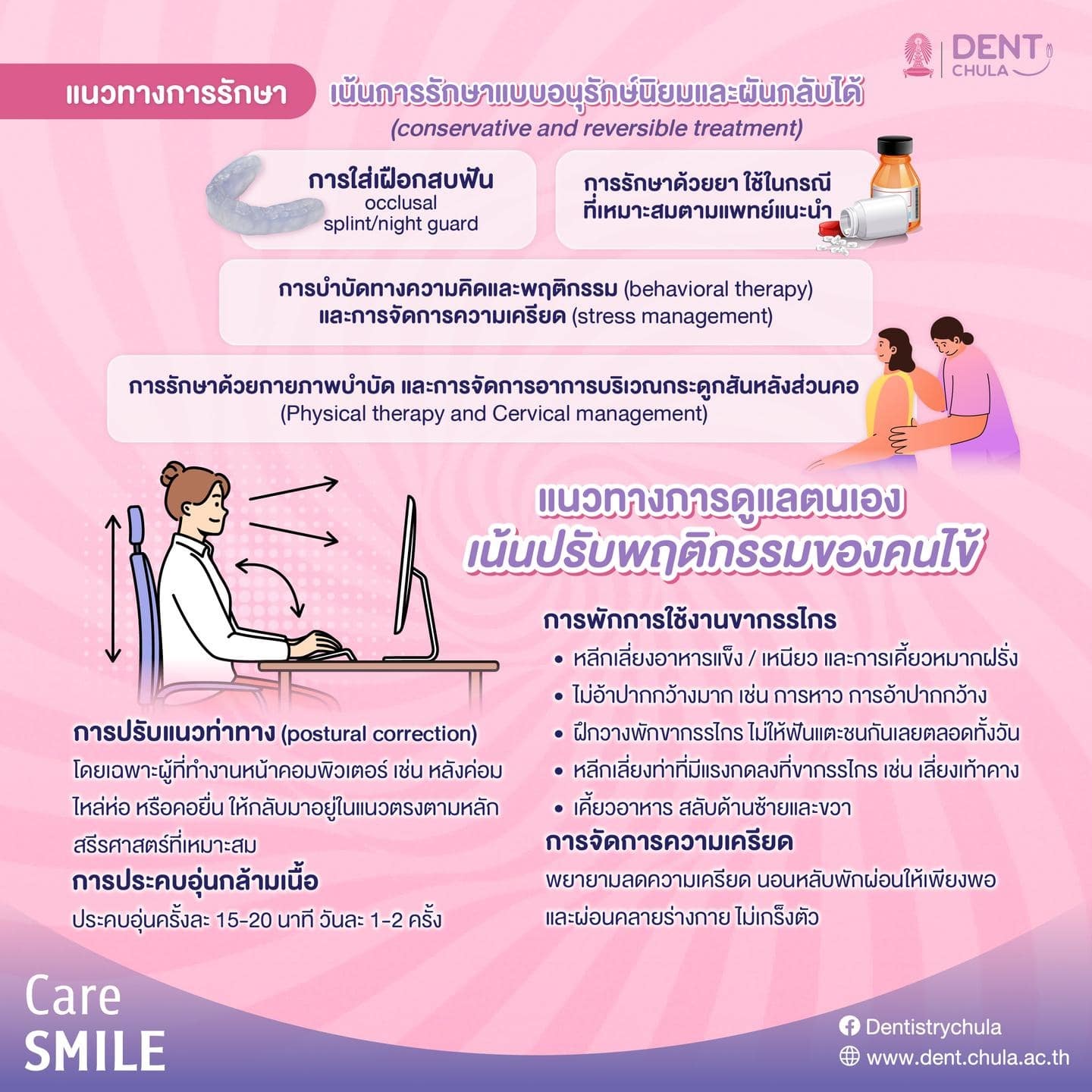 การรักษาที่สำคัญที่สุดของปัญหาขากรรไกรคือการปรับพฤติกรรมของคนไข้ แนวทางในการดูแลตนเองที่แนะนำมีดังนี้