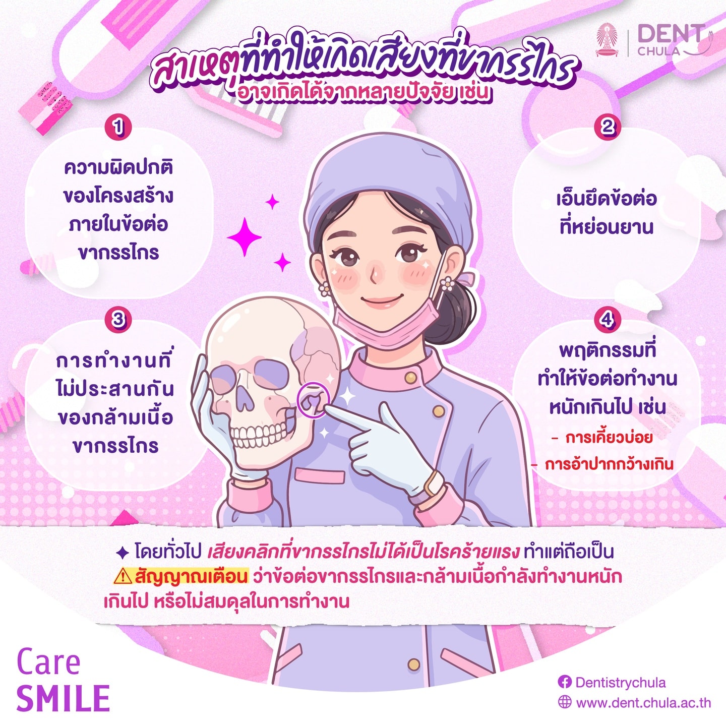 การเข้ารับการตรวจจากทันตแพทย์ผู้เชี่ยวชาญด้าน ทันตกรรมบดเคี้ยวและความเจ็บปวดช่องปากใบหน้า จะช่วยให้สามารถประเมินสาเหตุของอาการได้อย่างเหมาะสม และวางแผนการดูแลรักษาที่ถูกต้อง เพื่อให้ข้อต่อขากรรไกรสามารถทำงานได้อย่างปกติและปลอดภัยในระยะยาว