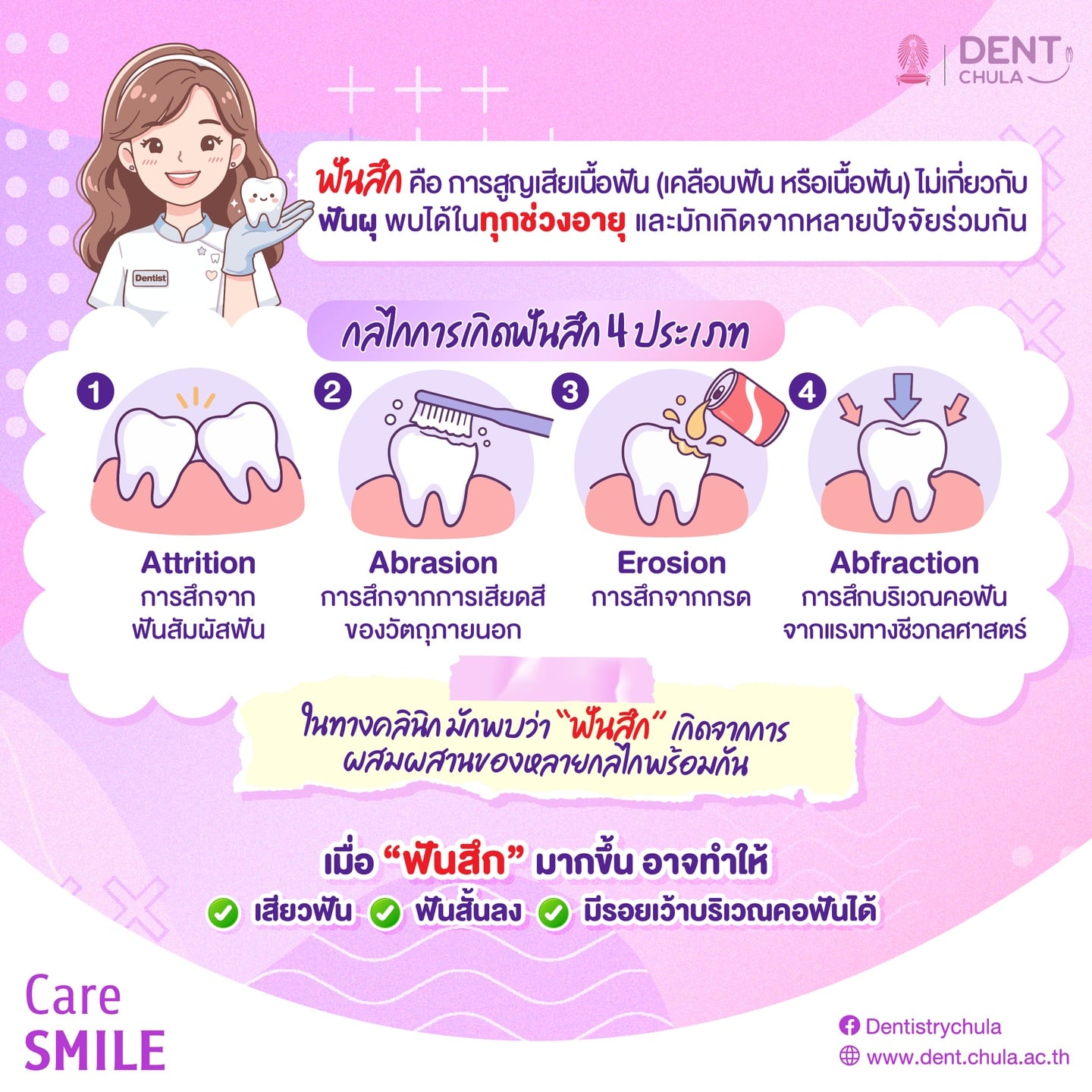 ฟันสึก หมายถึง การสูญเสียเนื้อฟัน ได้แก่ เคลือบฟัน และ/หรือเนื้อฟัน โดยไม่เกี่ยวข้องกับกระบวนการฟันผุ ภาวะนี้พบได้บ่อยในคนไข้ทุกช่วงอายุ และมักเกิดจากหลายปัจจัยร่วมกัน โดยสามารถแบ่งกลไกหลักออกเป็น 4 ประเภท ได้แก่