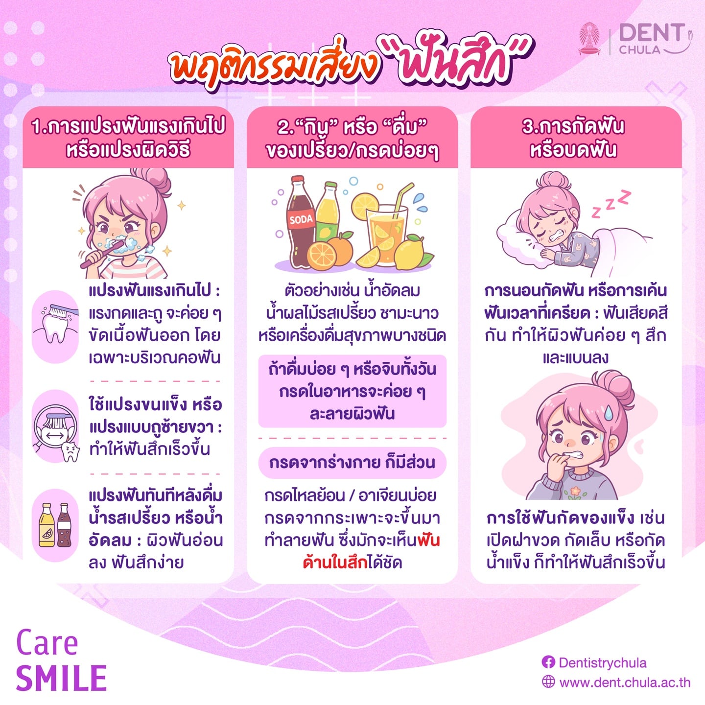 สาเหตุของฟันสึกมีหลายอย่าง แต่ที่สำคัญมาก คือ พฤติกรรมของเราเองซึ่งบางอย่างทำโดยไม่รู้ตัว และสะสมไปเรื่อย ๆ จนเกิดปัญหา พฤติกรรมที่พบบ่อย คือ การแปรงฟันแรงเกินไป หรือแปรงผิดวิธี หลายคนคิดว่ายิ่งแปรงแรง ฟันจะยิ่งสะอาด แต่จริง ๆ แล้วแรงกดและการถูไปมาจะค่อย ๆ ขัดเนื้อฟันออก โดยเฉพาะบริเวณคอฟันที่บางอยู่แล้ว ถ้าใช้แปรงขนแข็งหรือแปรงแบบถูซ้ายขวาในแนวนอนแรง ๆ เป็นประจำ ก็จะยิ่งทำให้ฟันสึกเร็วขึ้น อีกอย่างที่สำคัญคือการแปรงฟันทันทีหลังดื่มน้ำเปรี้ยวหรือน้ำอัดลม เพราะตอนนั้นผิวฟันจะอ่อนลง ทำให้สึกง่ายกว่าเดิม