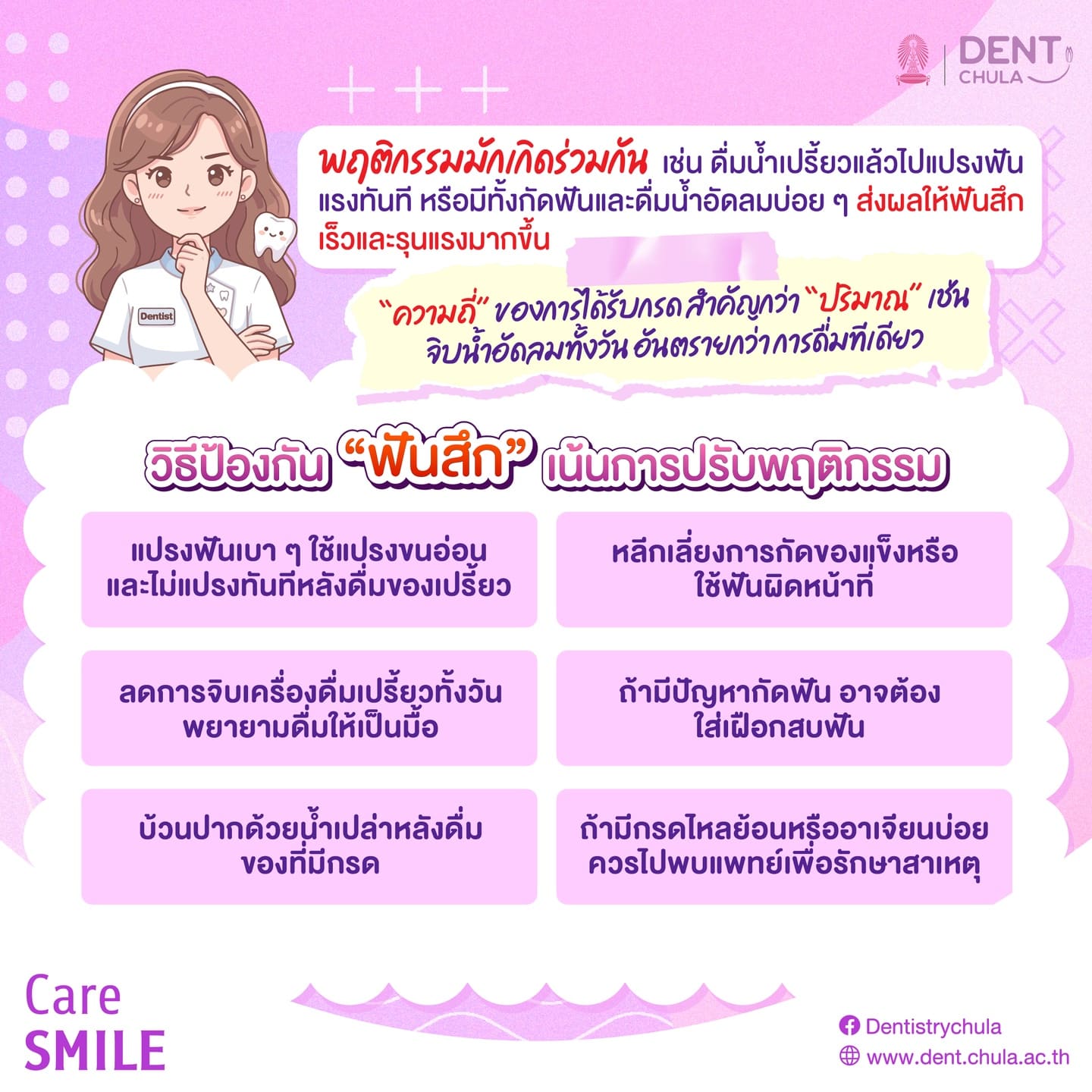ทั้งนี้ พฤติกรรมที่กล่าวมามักเกิดร่วมกัน เช่น ดื่มน้ำเปรี้ยวแล้วไปแปรงฟันแรงทันที หรือมีทั้งกัดฟันและดื่มน้ำอัดลมบ่อย ๆ แบบนี้จะทำให้ฟันสึกเร็วและรุนแรงมากขึ้น นอกจากนี้ สิ่งที่หลายคนอาจยังไม่ทราบคือ ความถี่ของการได้รับกรดนั้นสำคัญกว่าปริมาณ เช่น การจิบน้ำอัดลมทั้งวันก่อให้เกิดอันตรายต่อฟันกว่าการดื่มทีเดียว
