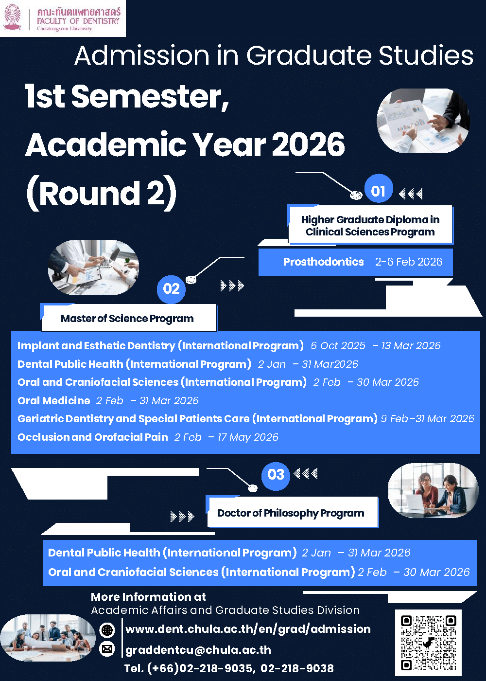 • ดูรายละเอียดเพิ่มเติมได้ที่ www.dent.chula.ac.th/en/grad/admission