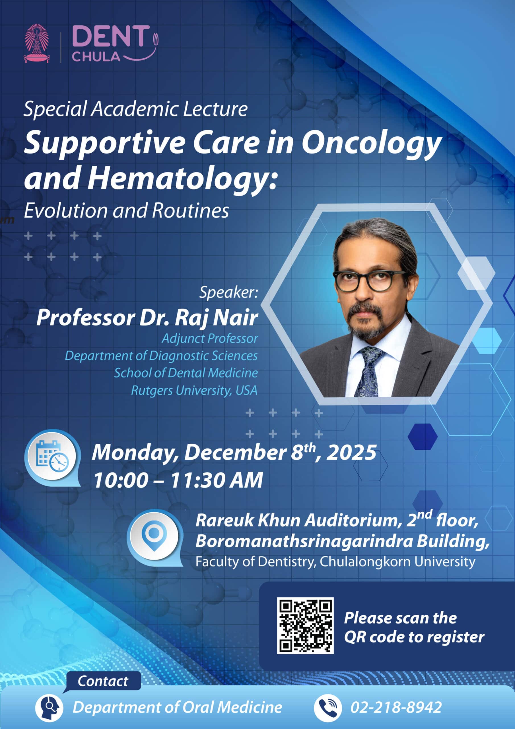 ขอเชิญทันตแพทย์ อาจารย์ นิสิต และผู้สนใจ ร่วมฟัง Special Academic Lecture หัวข้อ “Supportive Care in Oncology and Hematology: Evolution and Routines” โดย Professor Dr. Raj Nair