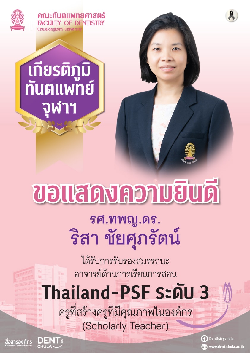 คณะทันตแพทยศาสตร์ จุฬาลงกรณ์มหาวิทยาลัย ขอแสดงความยินดีกับ รศ.ทพญ.ดร.ริสา ชัยศุภรัตน์ ในโอกาสได้รับการรับรองสมรรถนะอาจารย์ด้านการเรียนการสอน Thailand-PSF ระดับ 3 (Scholarly Teacher)