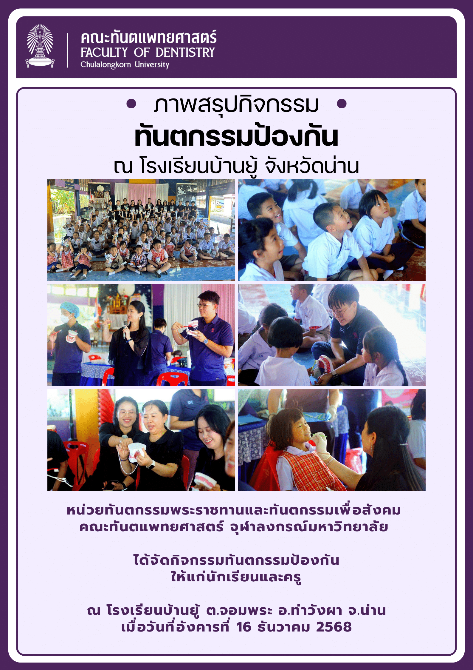 หน่วยทันตกรรมพระราชทานและทันตกรรมเพื่อสังคม คณะทันตแพทยศาสตร์ จุฬาลงกรณ์มหาวิทยาลัย จัดกิจกรรมทันตกรรมป้องกันให้แก่ นักเรียนและครู ณ โรงเรียนบ้านยู้ ตำบลจอมพระ อำเภอท่าวังผา จังหวัดน่าน