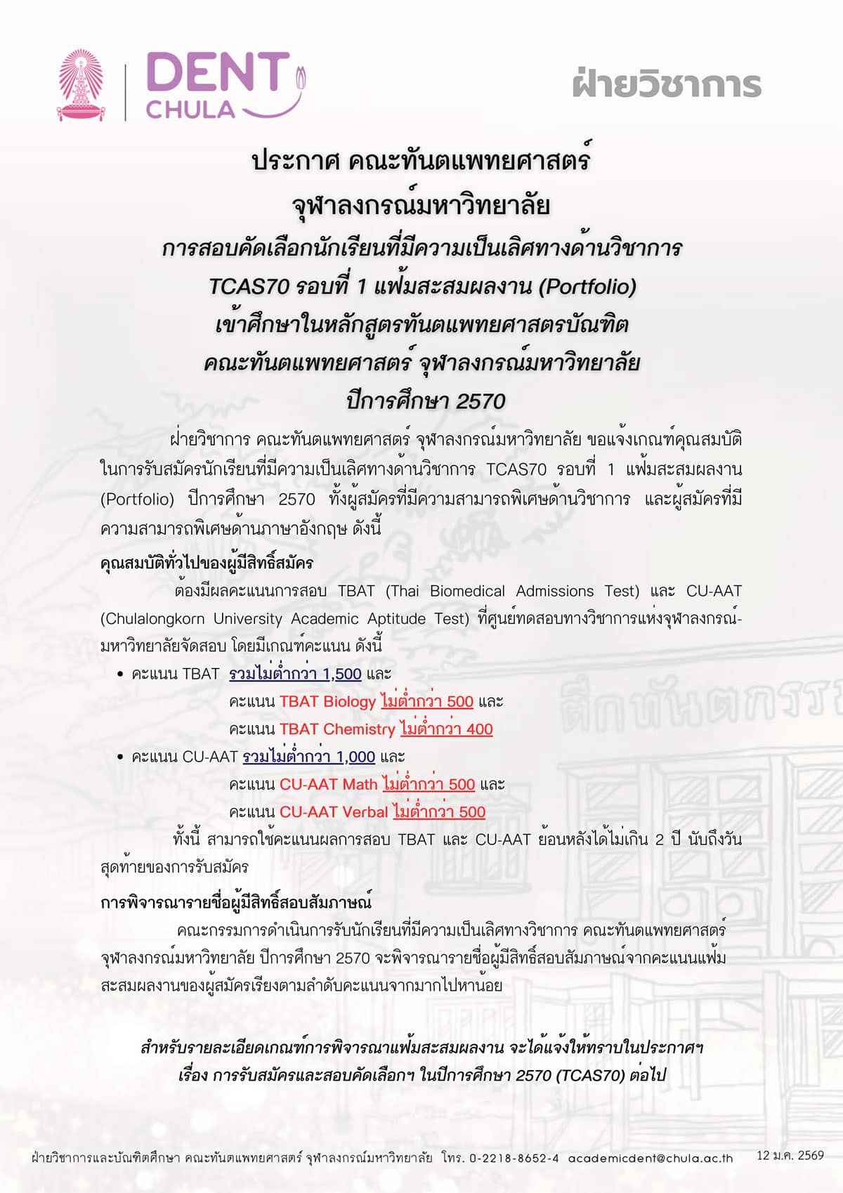 ฝ่ายวิชาการ คณะทันตแพทยศาสตร์ จุฬาลงกรณ์มหาวิทยาลัย ขอแจ้งเกณฑ์คุณสมบัติในการรับสมัครนักเรียนที่มีความเป็นเลิศทางด้านวิชาการ TCAS70 รอบที่ 1 แฟ้มสะสมผลงาน (Portfolio) ปีการศึกษา 2570 ทั้งผู้สมัครที่มีความสามารถพิเศษด้านวิชาการ และผู้สมัครที่มีความสามารถพิเศษด้านภาษาอังกฤษ ดังนี้
