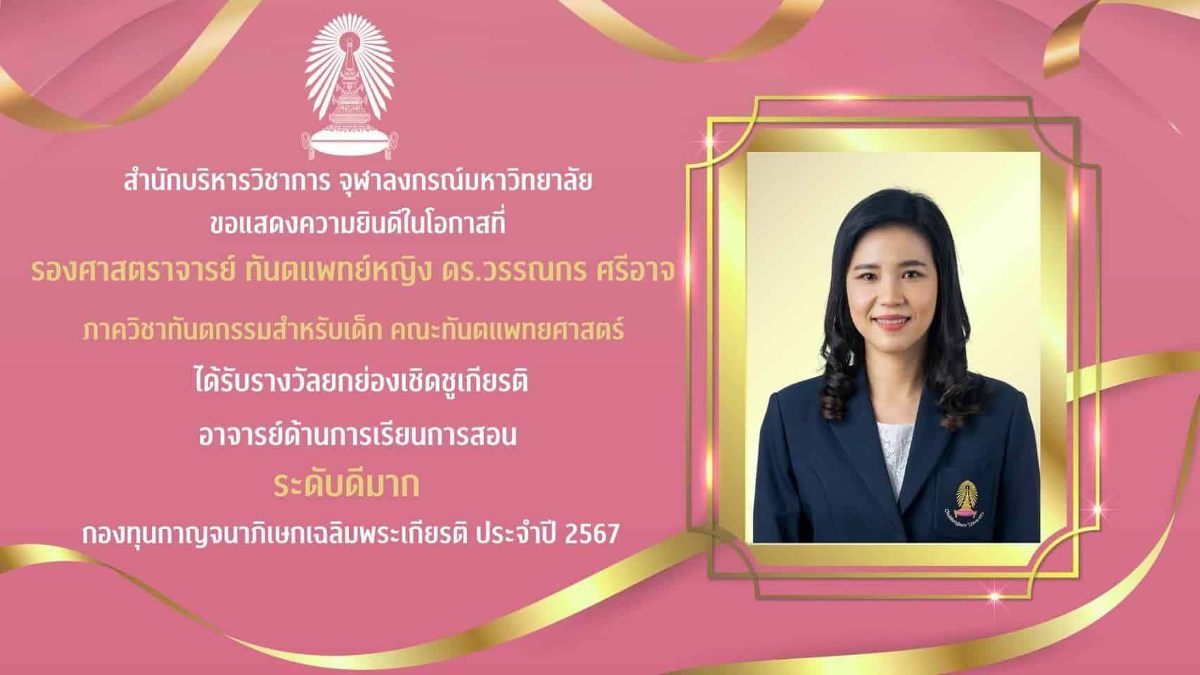 คณะทันตแพทยศาสตร์ จุฬาลงกรณ์มหาวิทยาลัย ขอแสดงความยินดีกับ รองศาสตราจารย์ ทันตแพทย์หญิง ดร.วรรณกร ศรีอาจ ภาควิชาทันตกรรมสำหรับเด็ก