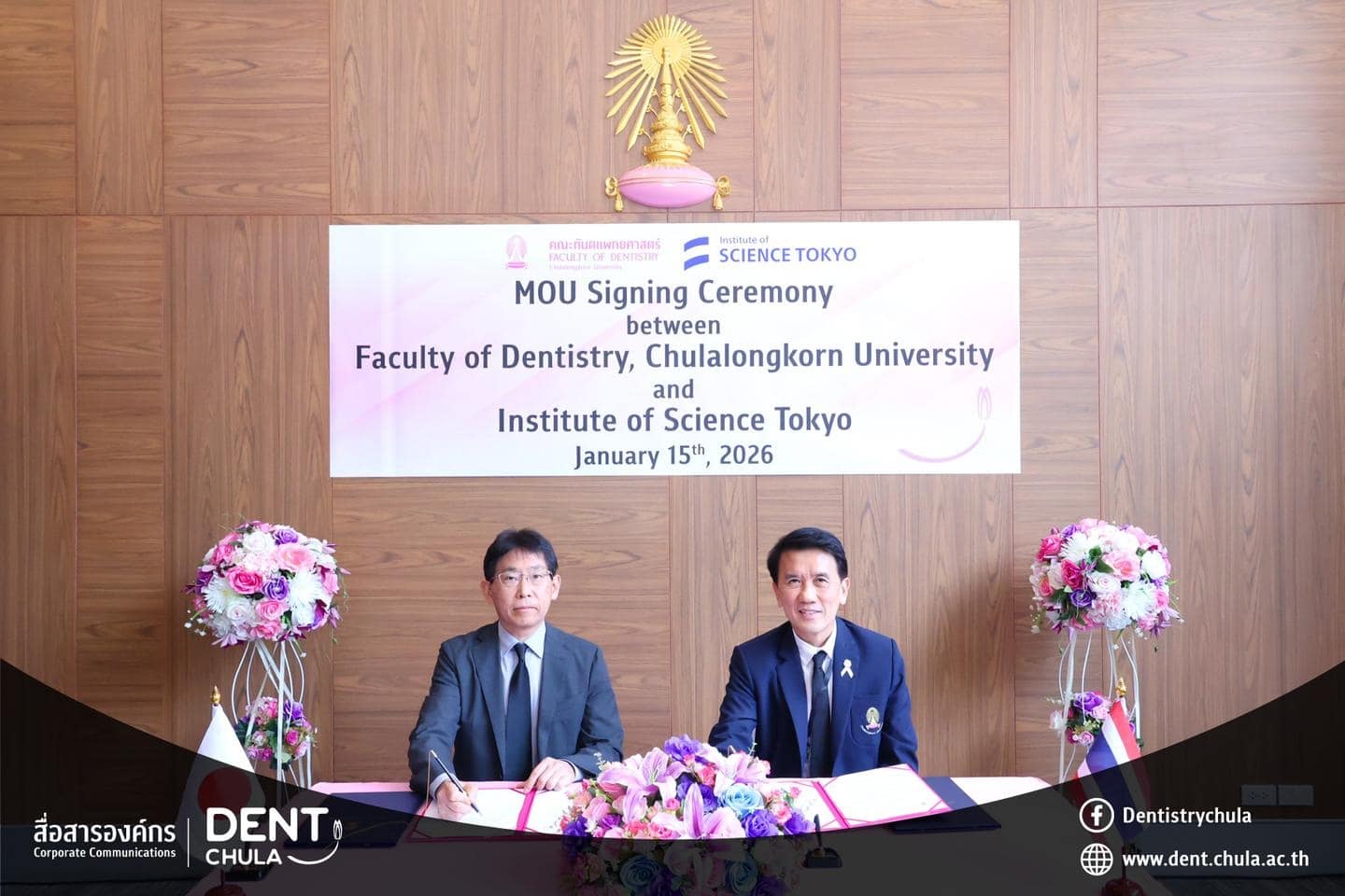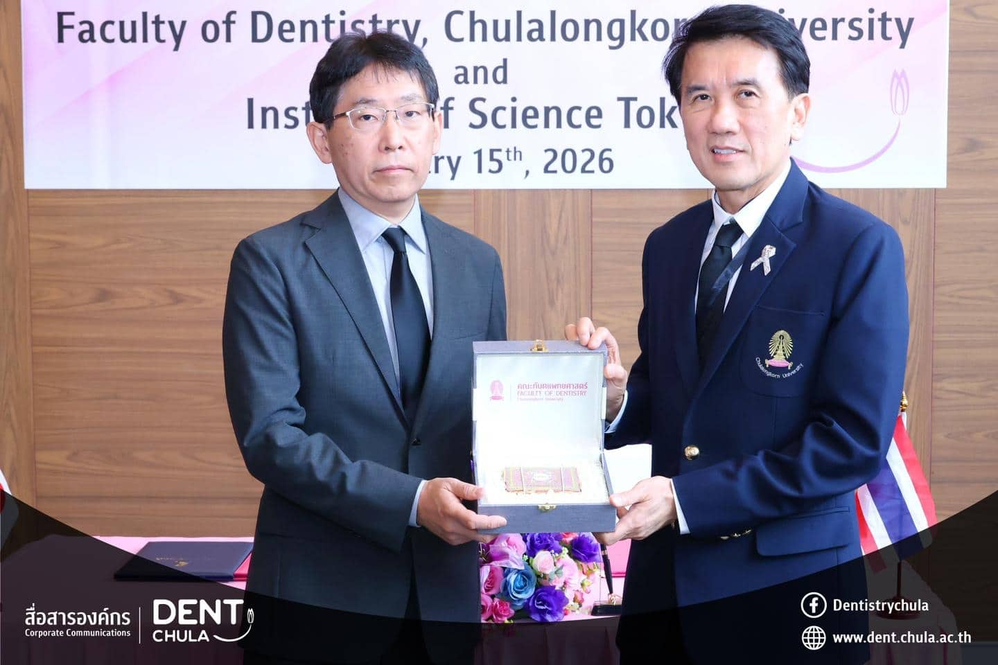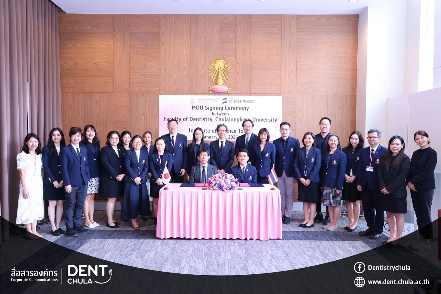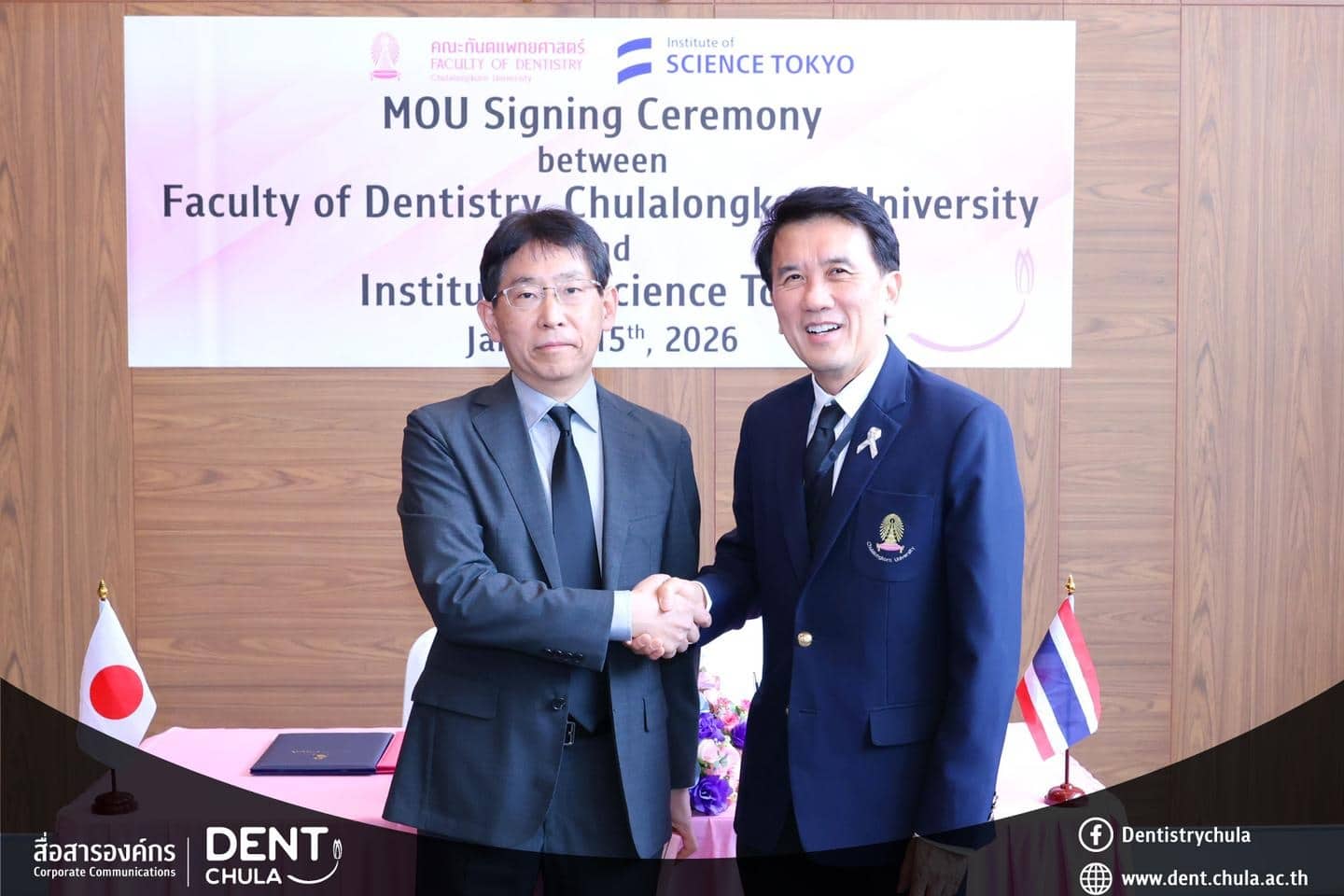 คณะทันตแพทยศาสตร์ จุฬาลงกรณ์มหาวิทยาลัย ให้การต้อนรับคณะผู้แทนจาก Institute of Science Tokyo ประเทศญี่ปุ่น นำโดย Prof. Kenji FUEKI (คณบดี) พร้อมด้วย Prof. Takashi ONO, Prof. Keiji MORIYAMA และ Ms. Hitomi IIZAWA ในโอกาสเดินทางมาเยือนเพื่อหารือความร่วมมือทางวิชาการ การดำเนินงาน หลักสูตรร่วมสองสถาบัน และร่วมพิธีลงนามในบันทึกความเข้าใจ ระหว่างทั้งสองสถาบัน พร้อมกิจกรรมแลกเปลี่ยนพูดคุย ถามตอบ และให้คำปรึกษาแบบรายบุคคลด้านงานวิจัย เพื่อเสริมสร้างเครือข่ายความร่วมมือและพัฒนาความสัมพันธ์ทางวิชาการระหว่างสองสถาบันอย่างยั่งยืน เมื่อวันพฤหัสบดีที่ 15 มกราคม 2569 ณ ห้องรฦกคุณ ชั้น 2 อาคารบรมนาถศรีนครินทร์ คณะทันตแพทยศาสตร์ จุฬาลงกรณ์มหาวิทยาลัย