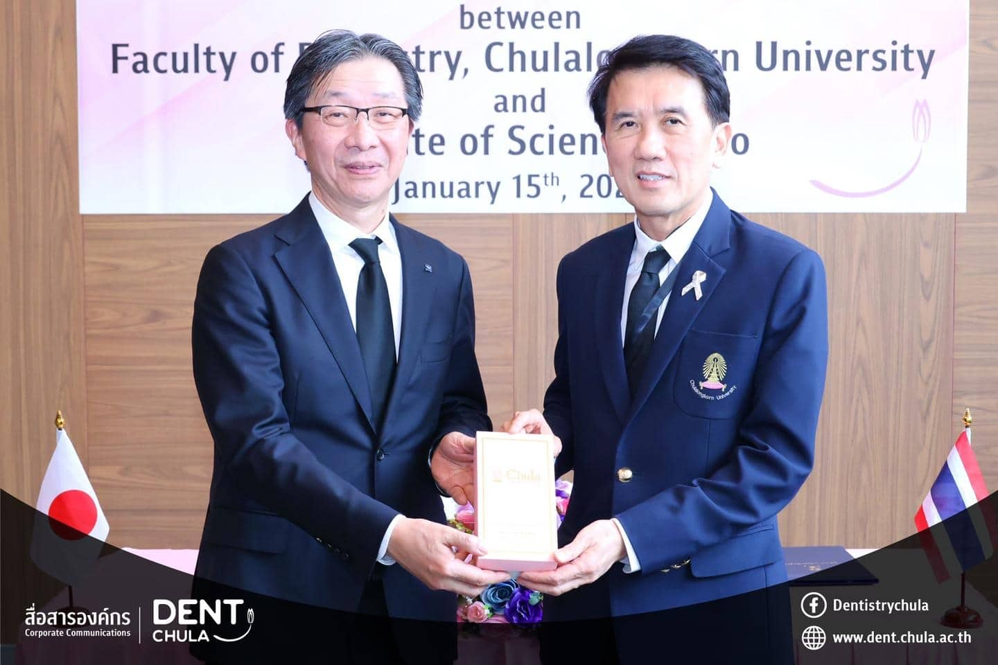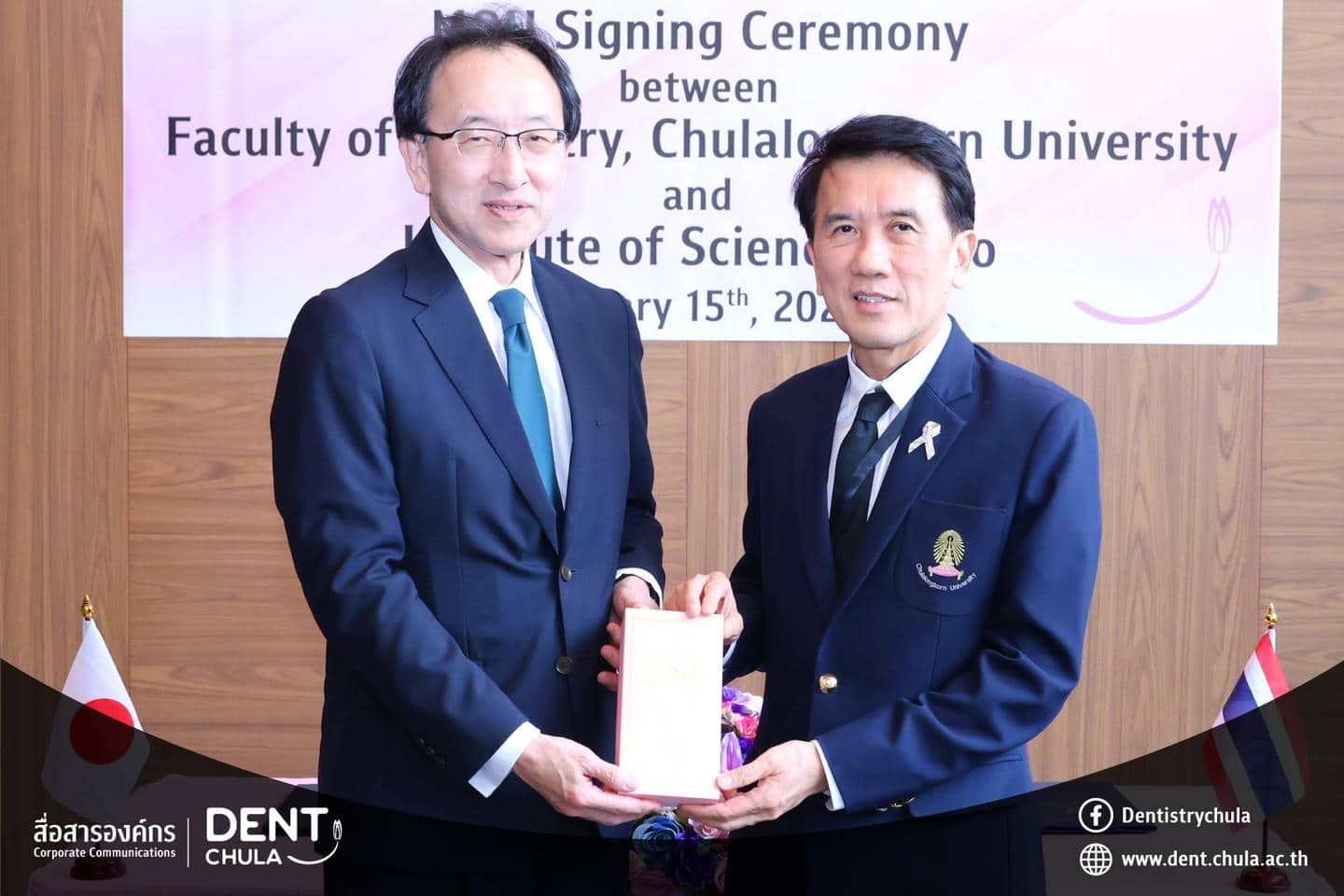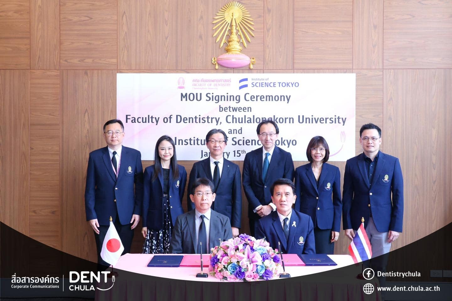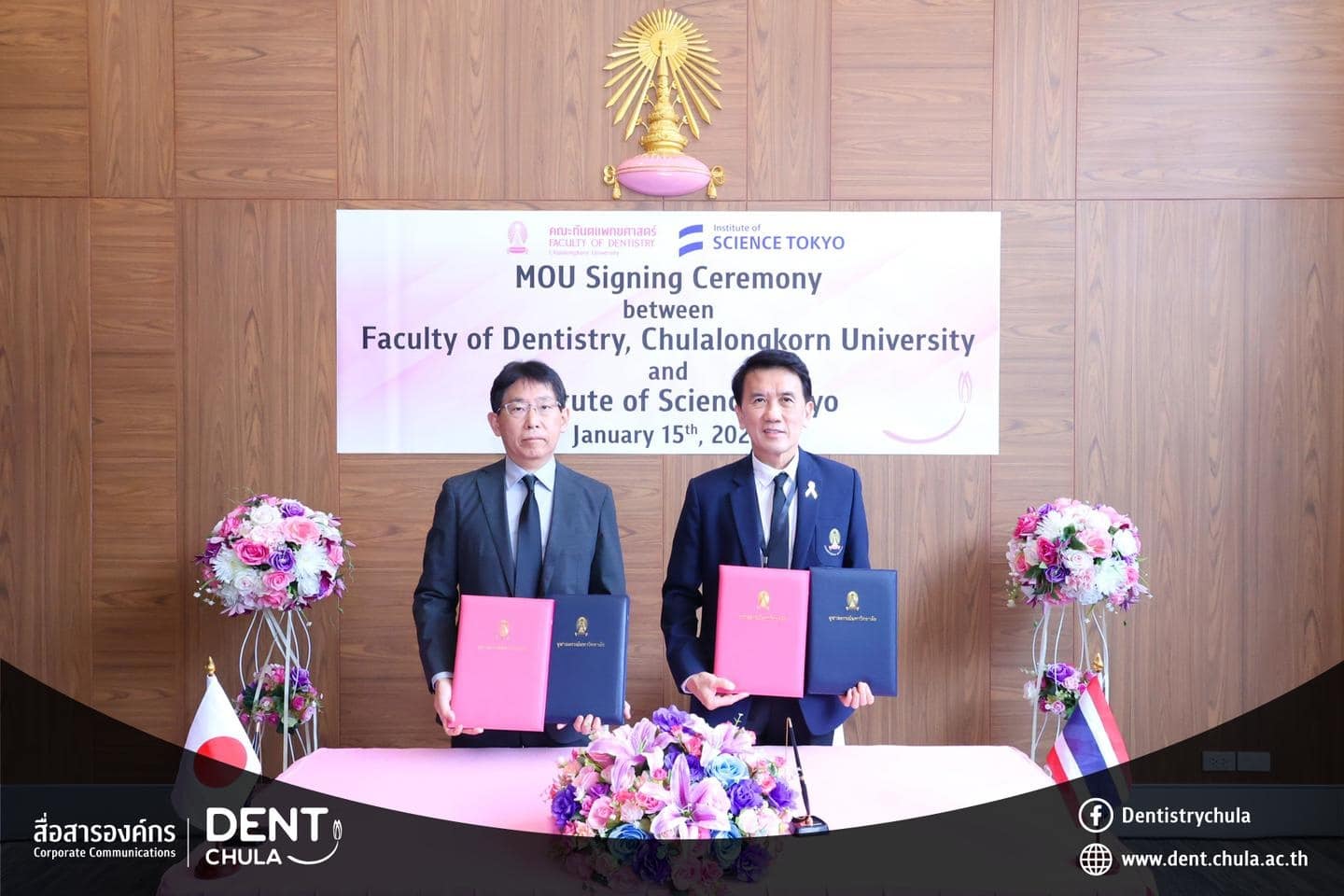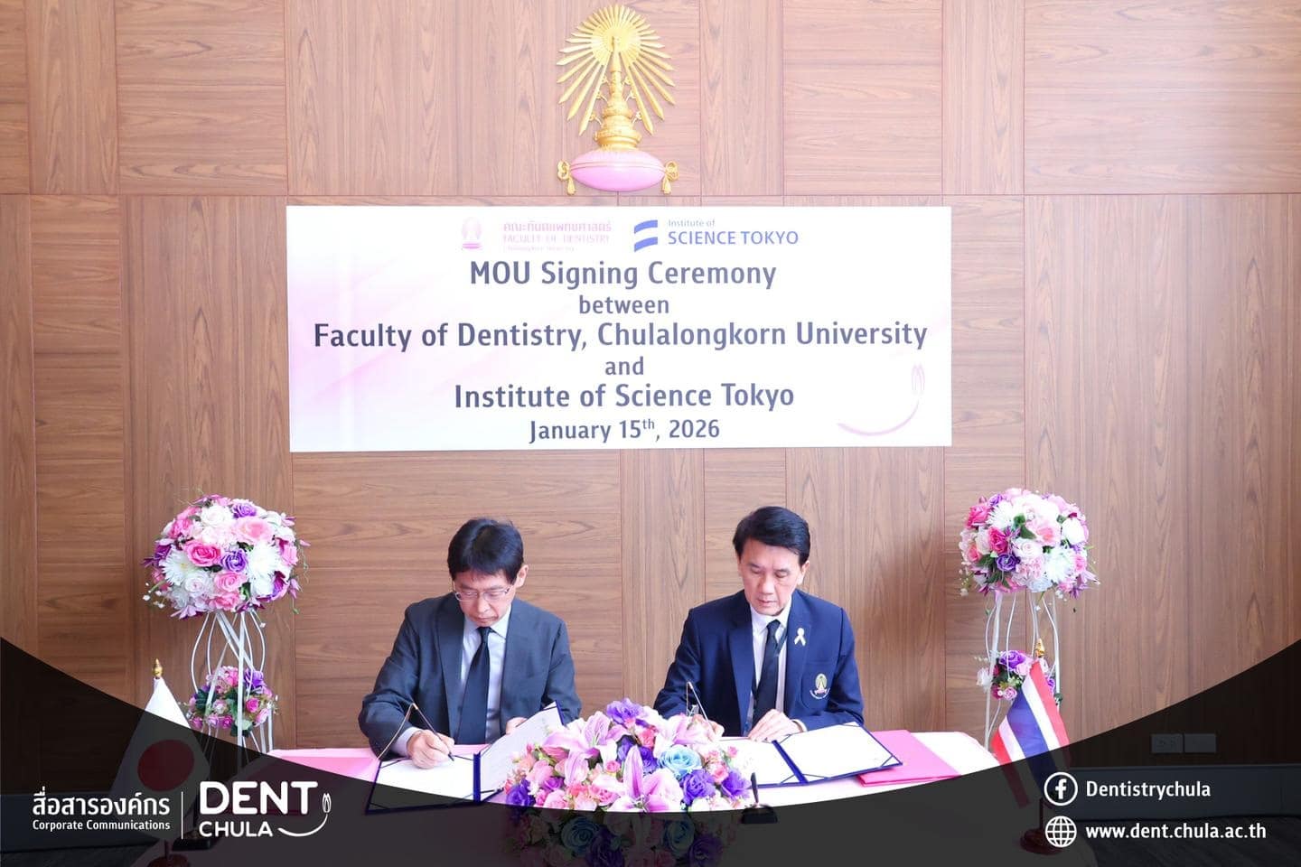 คณะทันตแพทยศาสตร์ จุฬาลงกรณ์มหาวิทยาลัย ให้การต้อนรับคณะผู้แทนจาก Institute of Science Tokyo ประเทศญี่ปุ่น นำโดย Prof. Kenji FUEKI (คณบดี) พร้อมด้วย Prof. Takashi ONO, Prof. Keiji MORIYAMA และ Ms. Hitomi IIZAWA ในโอกาสเดินทางมาเยือนเพื่อหารือความร่วมมือทางวิชาการ การดำเนินงาน หลักสูตรร่วมสองสถาบัน และร่วมพิธีลงนามในบันทึกความเข้าใจ ระหว่างทั้งสองสถาบัน พร้อมกิจกรรมแลกเปลี่ยนพูดคุย ถามตอบ และให้คำปรึกษาแบบรายบุคคลด้านงานวิจัย เพื่อเสริมสร้างเครือข่ายความร่วมมือและพัฒนาความสัมพันธ์ทางวิชาการระหว่างสองสถาบันอย่างยั่งยืน เมื่อวันพฤหัสบดีที่ 15 มกราคม 2569 ณ ห้องรฦกคุณ ชั้น 2 อาคารบรมนาถศรีนครินทร์ คณะทันตแพทยศาสตร์ จุฬาลงกรณ์มหาวิทยาลัย
