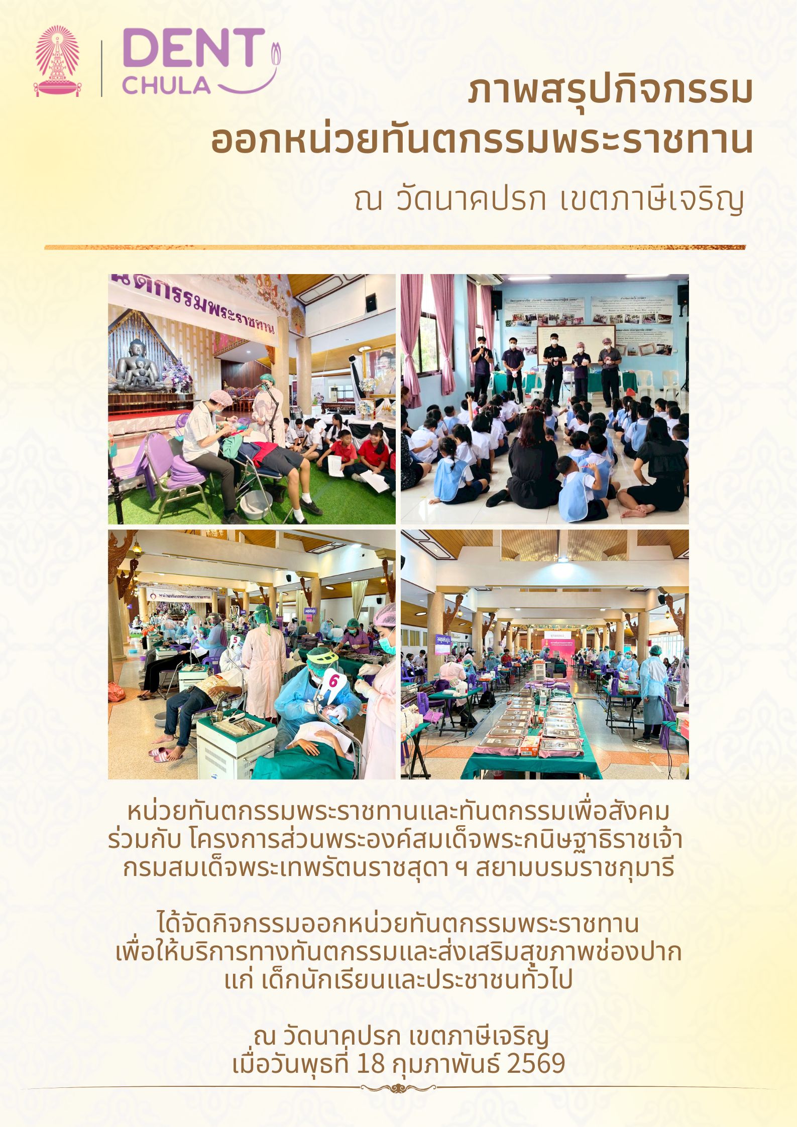 หน่วยทันตกรรมพระราชทานและทันตกรรมเพื่อสังคม คณะทันตแพทยศาสตร์ จุฬาลงกรณ์มหาวิทยาลัย ร่วมกับ โครงการส่วนพระองค์สมเด็จพระกนิษฐาธิราชเจ้า กรมสมเด็จพระเทพรัตนราชสุดา ฯ สยามบรมราชกุมารี จัดกิจกรรมออกหน่วยทันตกรรมพระราชทาน ณ วัดนาคปรก เขตภาษีเจริญ กรุงเทพฯ