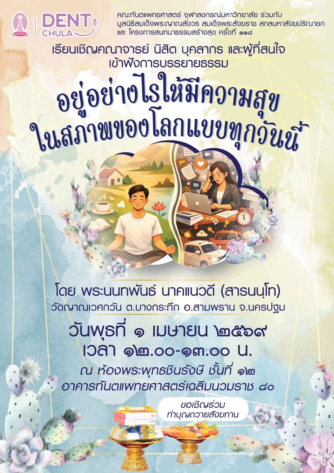 คณะทันตแพทยศาสตร์ จุฬาฯ จัดบรรยายธรรม เรื่อง “อยู่อย่างไรให้มีความสุข ในสภาพของโลกแบบทุกวันนี้” วันพุธที่ 1 เมษายน 2569