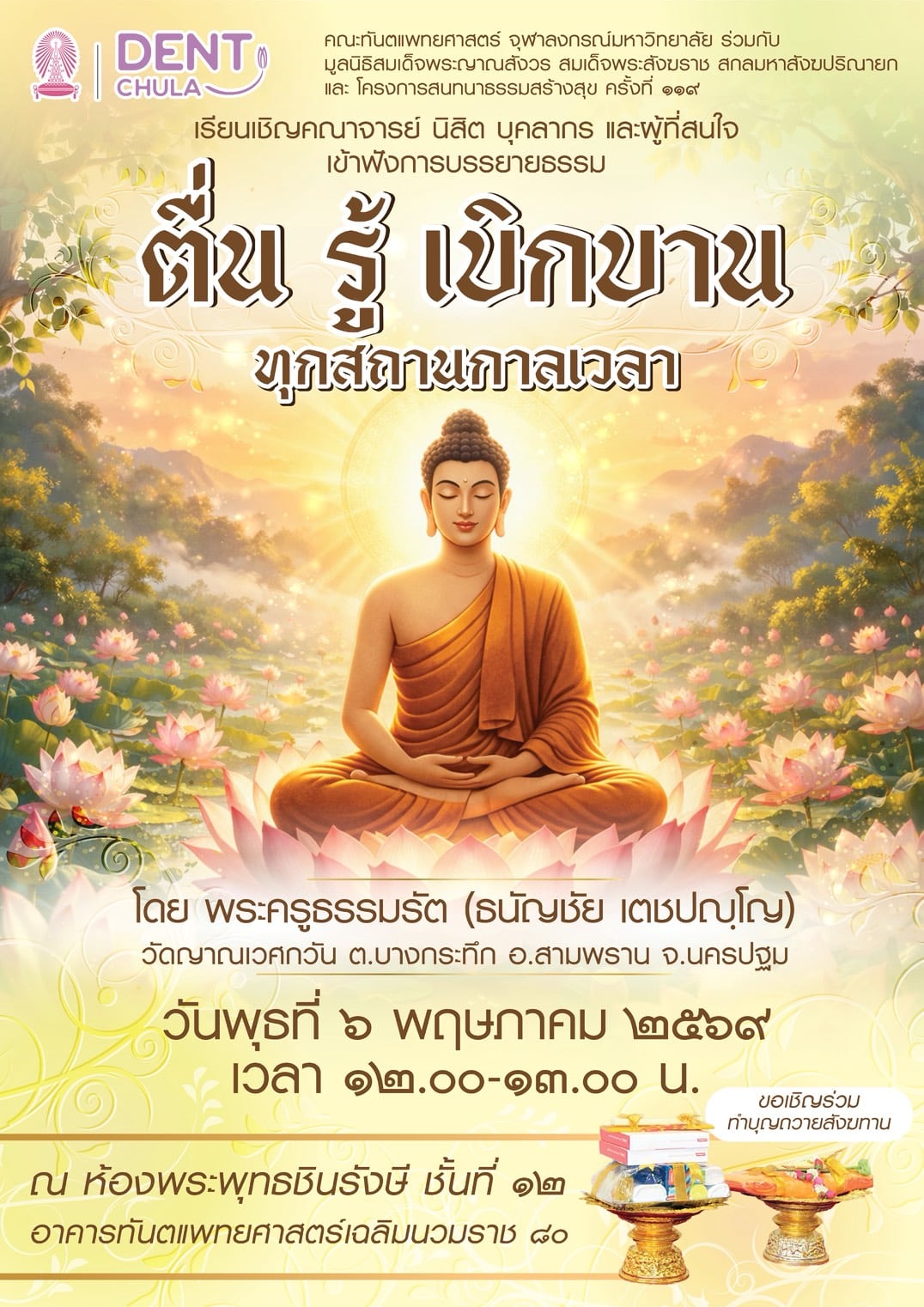 คณะทันตแพทยศาสตร์ จุฬาฯ จัดบรรยายธรรม เรื่อง “ตื่น รู้ เบิกบาน ทุกสถานกาลเวลา” วันพุธที่ 6 พฤษภาคม 2569