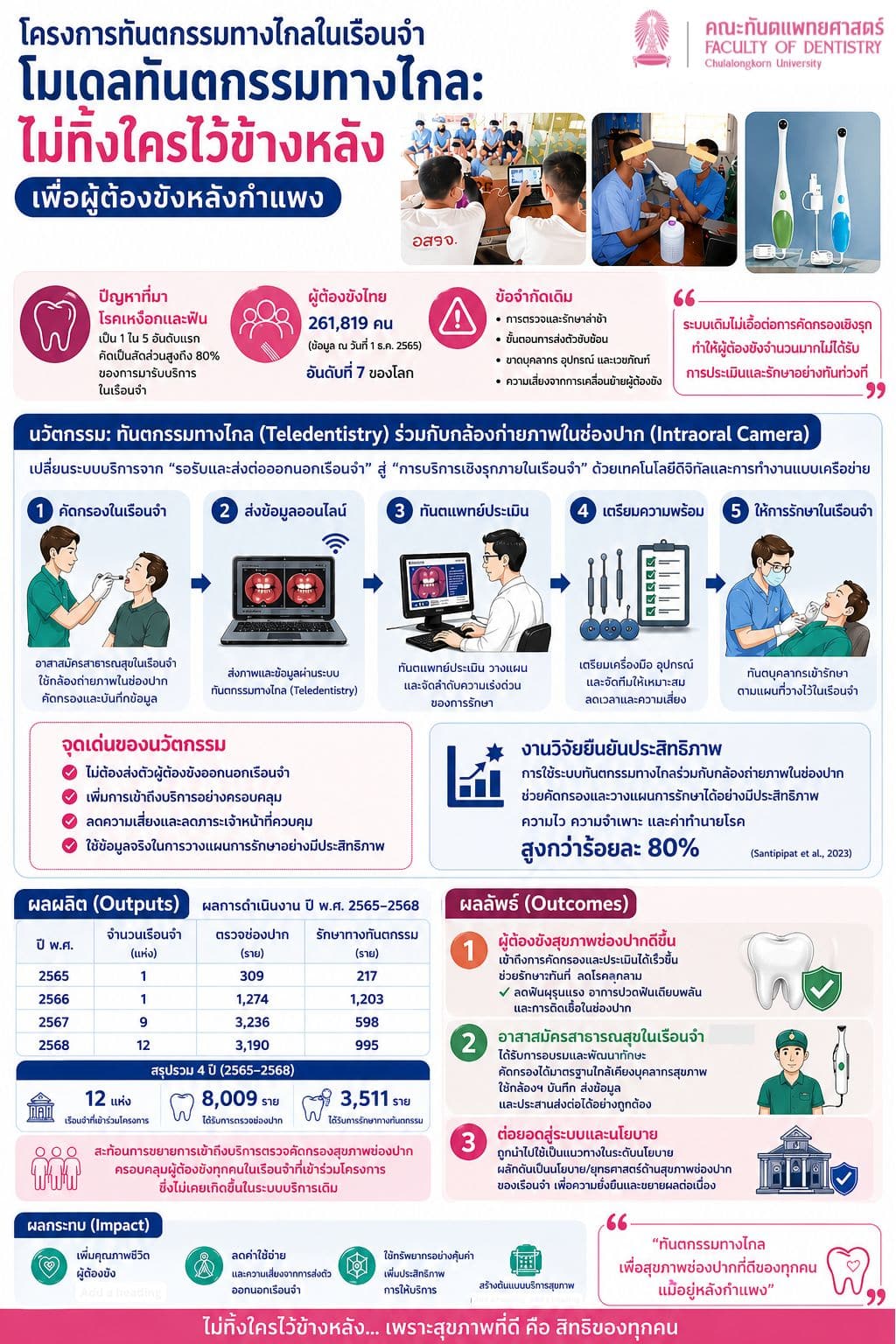 ปัจจุบันประเทศไทยมีจำนวนผู้ต้องขังเพิ่มขึ้นอย่างต่อเนื่อง โดยอยู่ในอันดับที่ 7 ของโลก มีผู้ต้องขังจำนวน 261,819 คน (ข้อมูล ณ วันที่ 1 ธันวาคม 2565) ทำให้ในเรือนจำมีสภาพแวดล้อมที่แออัด ส่งผลต่อการจัดการและการดูแลสุขภาพของผู้ต้องขัง จากผลการสำรวจ 10 อันดับความเจ็บป่วยแรกของผู้ต้องขังที่มาตรวจรักษาที่สถานพยาบาลเรือนจำ ประจำปี 2561 และข้อมูลจากสถานพินิจเด็กและเยาวชน รวมถึงศูนย์ฝึกและอบรมเด็กและเยาวชน พบว่าโรคเหงือกและฟันเป็นหนึ่งใน 5 อันดับแรกของการเข้ารับการตรวจรักษาที่สถานพยาบาลเรือนจำ คิดเป็นสัดส่วนสูงถึงร้อยละ 80 ผู้ต้องขังยังมีปัจจัยเสี่ยงต่อการเกิดโรคในช่องปากจากทั้งด้านพฤติกรรมและสิ่งแวดล้อม ได้แก่ การดูแลสุขอนามัยช่องปากที่ไม่เหมาะสม การบริโภคน้ำตาล และโรคเรื้อรัง ส่งผลให้ความต้องการการรักษาทางทันตกรรมเพิ่มขึ้นอย่างมีนัยสำคัญ (Amaya et al., 2023) ซึ่งสอดคล้องกับข้อมูลที่ระบุว่าผู้ต้องขังที่มีปัญหาสุขภาพช่องปากได้รับการรักษาที่เหมาะสมเพียงร้อยละ 9 – 29 สะท้อนถึงการขาดแคลนอุปกรณ์ เวชภัณฑ์ และบริการทางการแพทย์เฉพาะทางที่ไม่สอดคล้องกับความต้องการของประชากรในเรือนจำ (FIDH, 2023) โดยรูปแบบการให้บริการทางทันตกรรมในเรือนจำที่ผ่านมาส่วนใหญ่เป็นการให้บริการเชิงรับการส่งผู้ต้องขังไปรับการรักษานอกเรือนจำมีข้อจำกัดสูงทั้งด้านระเบียบ ความปลอดภัย และอัตรากำลังบุคลากร โดยต้องมีเจ้าหน้าที่ควบคุมอย่างน้อย 2 คนติดตามตลอด 24 ชั่วโมง ส่งผลให้การส่งต่อสามารถดำเนินการได้เฉพาะกรณีที่มีภาวะวิกฤตหรือความจำเป็นเร่งด่วนเท่านั้น