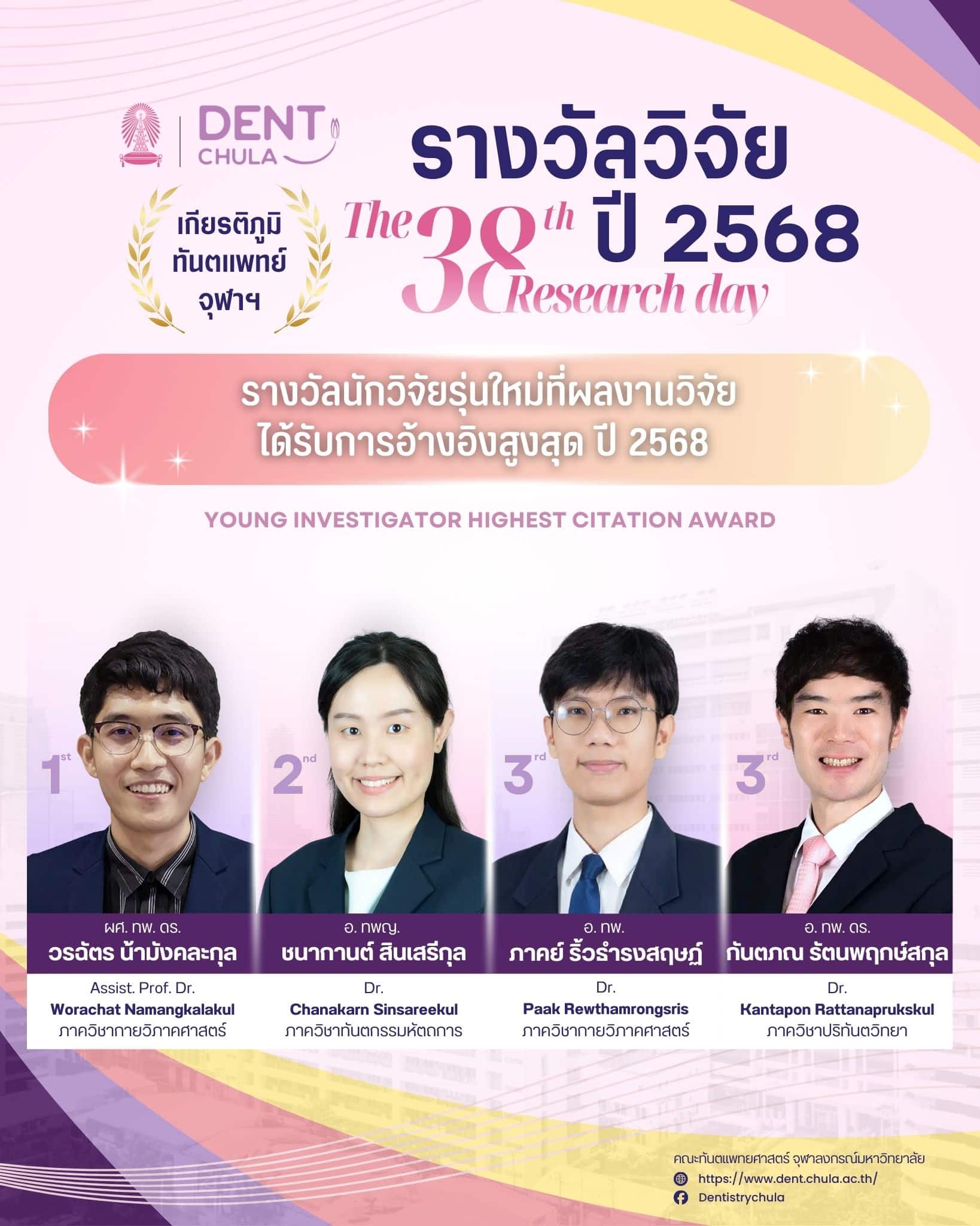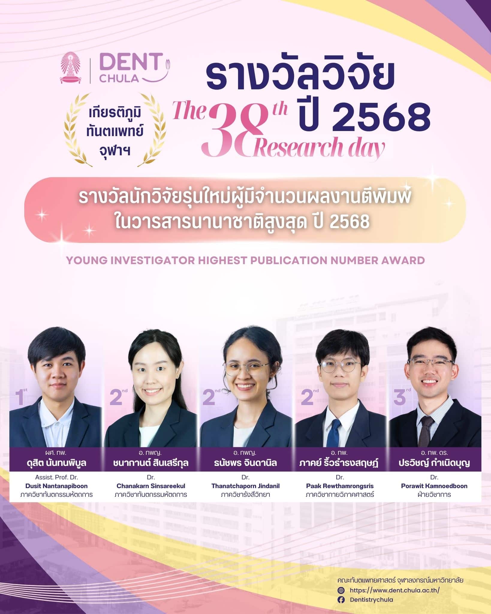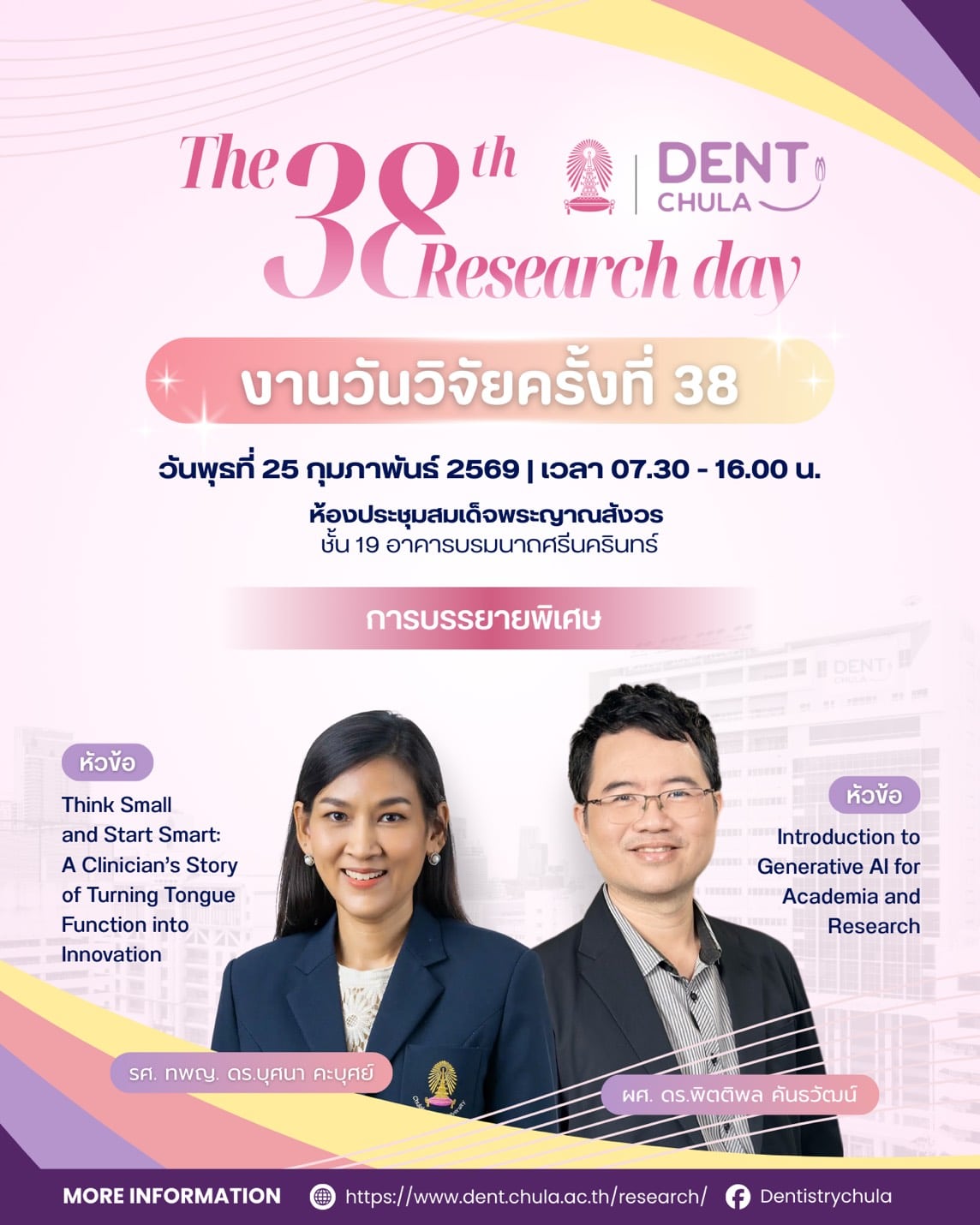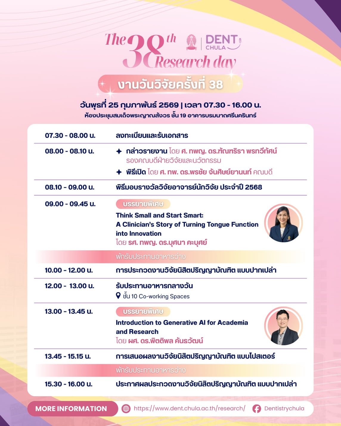 งานนี้เป็นโอกาสที่ดีในการนำเสนอผลงานวิจัยจากคณาจารย์และนิสิต คณะทันตแพทยศาสตร์ จุฬาลงกรณ์มหาวิทยาลัย ซึ่งจะช่วยเสริมสร้างการแลกเปลี่ยนความรู้และประสบการณ์อันมีค่า ทั้งยังเป็นเวทีสำคัญในการสร้างแรงบันดาลใจให้กับการพัฒนางานวิจัยและนวัตกรรมในวงการทันตแพทยศาสตร์ ภายในงานท่านจะได้พบกับการนำเสนอจากนักวิจัยรุ่นใหม่ พร้อมการบรรยายจากผู้เชี่ยวชาญในวงการที่จะมาร่วมแบ่งปันความรู้และประสบการณ์ในการวิจัย