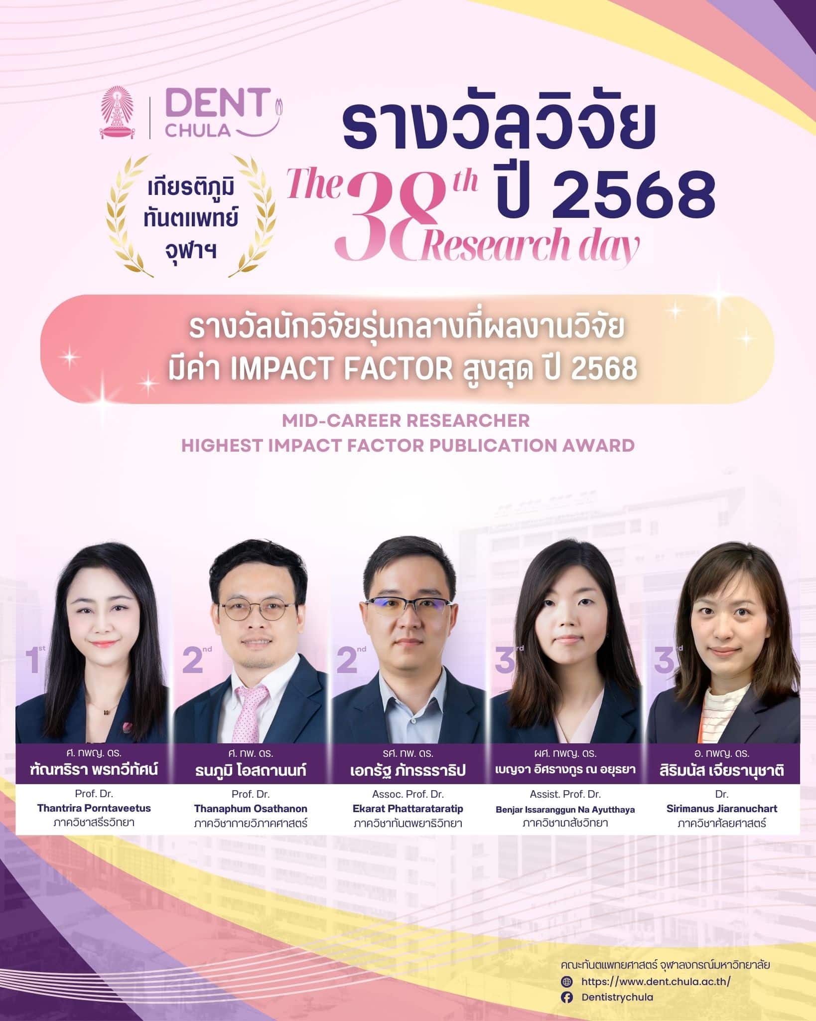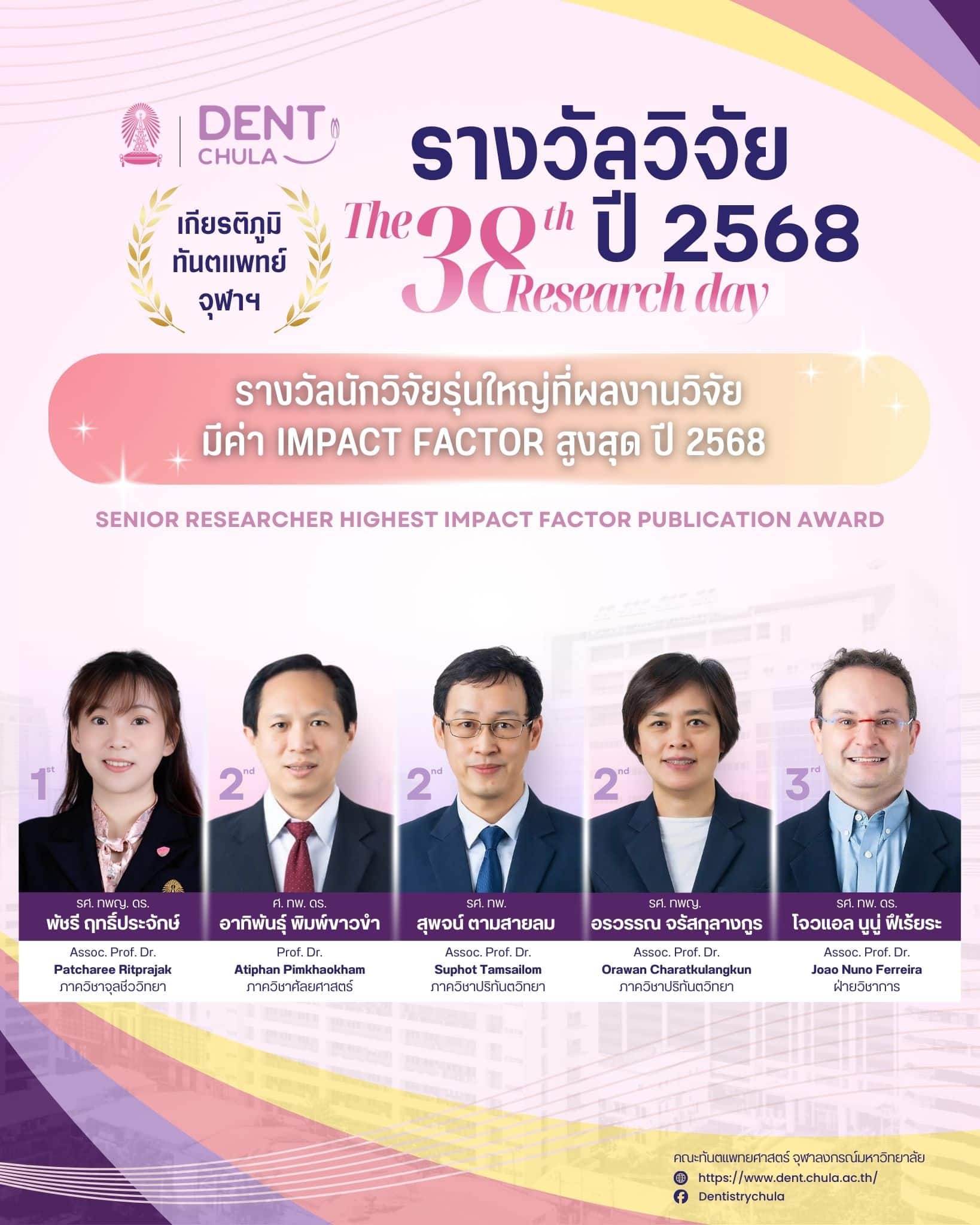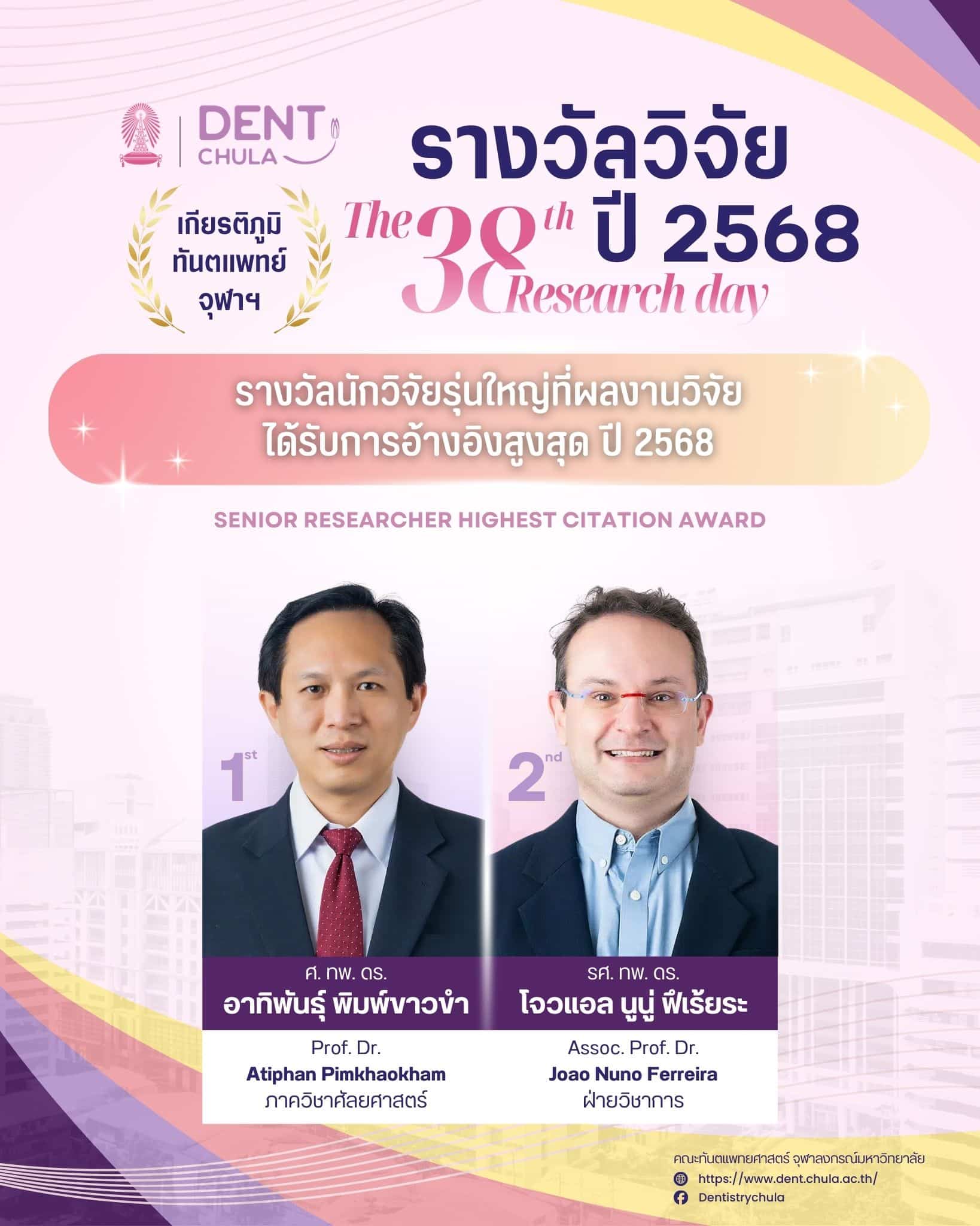 งานนี้เป็นโอกาสที่ดีในการนำเสนอผลงานวิจัยจากคณาจารย์และนิสิต คณะทันตแพทยศาสตร์ จุฬาลงกรณ์มหาวิทยาลัย ซึ่งจะช่วยเสริมสร้างการแลกเปลี่ยนความรู้และประสบการณ์อันมีค่า ทั้งยังเป็นเวทีสำคัญในการสร้างแรงบันดาลใจให้กับการพัฒนางานวิจัยและนวัตกรรมในวงการทันตแพทยศาสตร์ ภายในงานท่านจะได้พบกับการนำเสนอจากนักวิจัยรุ่นใหม่ พร้อมการบรรยายจากผู้เชี่ยวชาญในวงการที่จะมาร่วมแบ่งปันความรู้และประสบการณ์ในการวิจัย