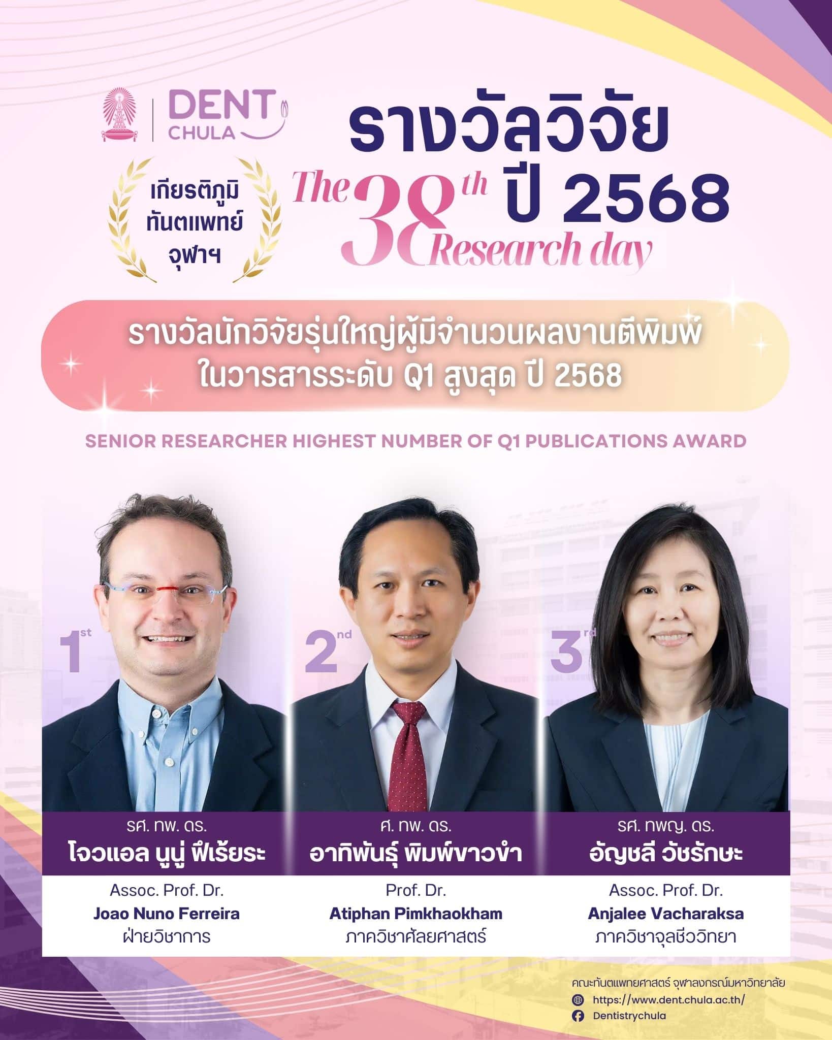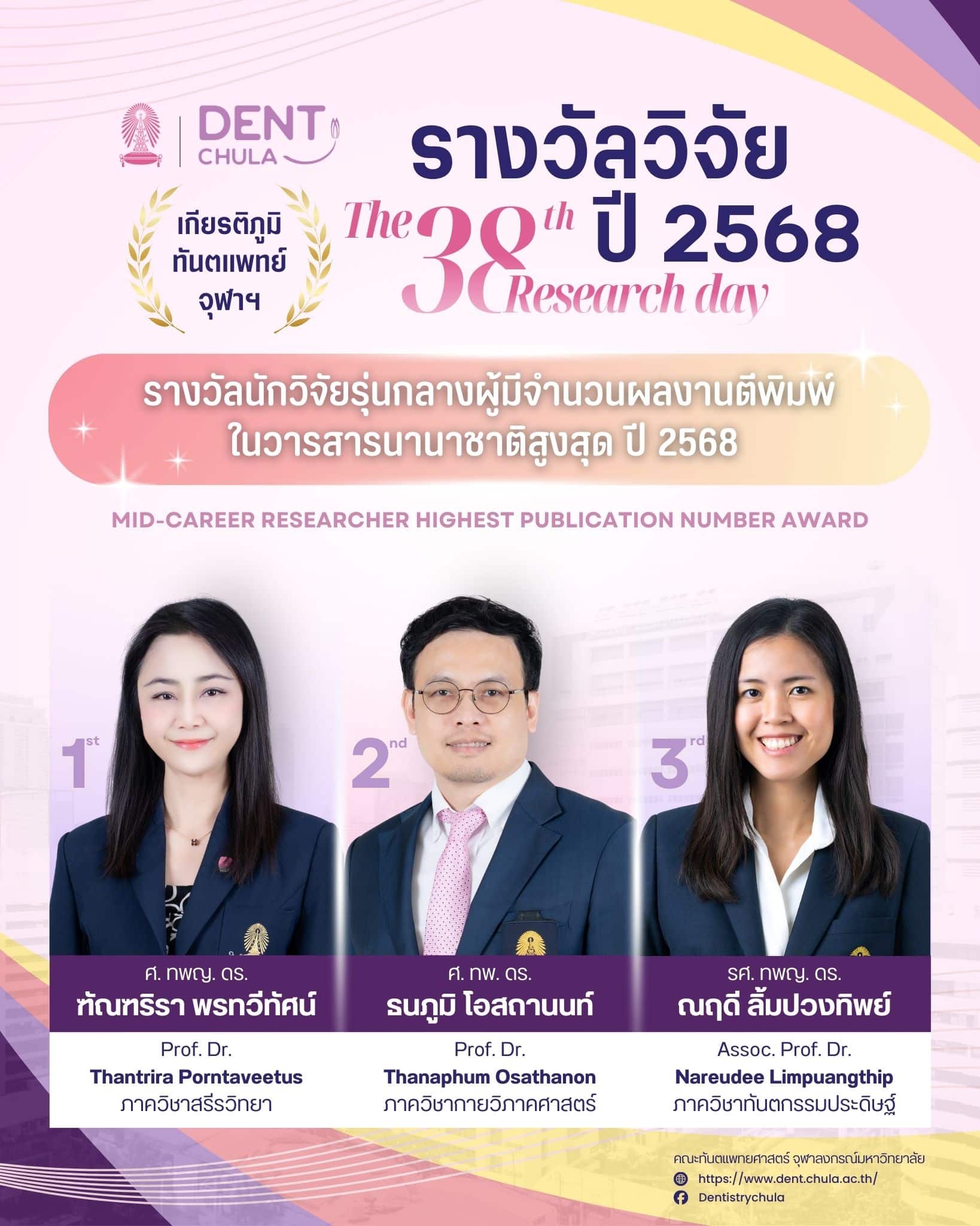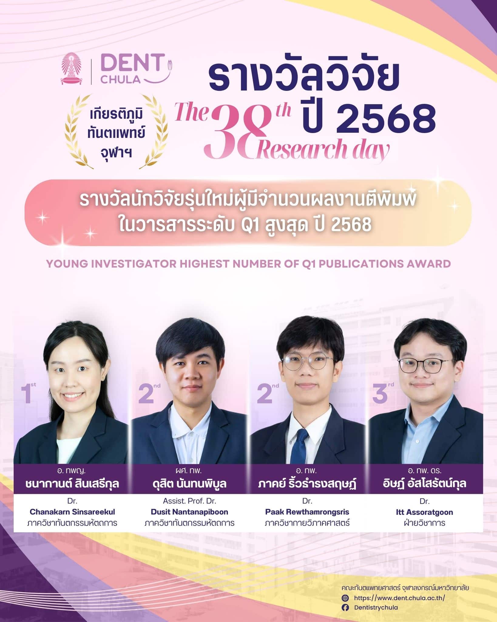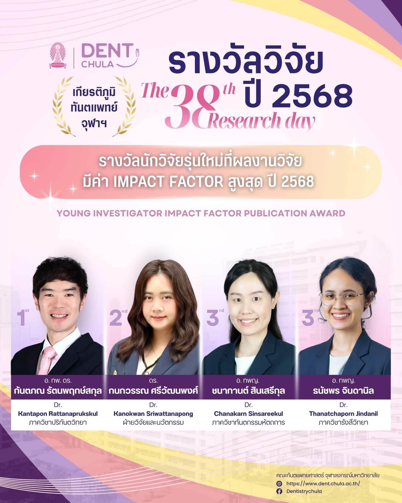 งานนี้เป็นโอกาสที่ดีในการนำเสนอผลงานวิจัยจากคณาจารย์และนิสิต คณะทันตแพทยศาสตร์ จุฬาลงกรณ์มหาวิทยาลัย ซึ่งจะช่วยเสริมสร้างการแลกเปลี่ยนความรู้และประสบการณ์อันมีค่า ทั้งยังเป็นเวทีสำคัญในการสร้างแรงบันดาลใจให้กับการพัฒนางานวิจัยและนวัตกรรมในวงการทันตแพทยศาสตร์ ภายในงานท่านจะได้พบกับการนำเสนอจากนักวิจัยรุ่นใหม่ พร้อมการบรรยายจากผู้เชี่ยวชาญในวงการที่จะมาร่วมแบ่งปันความรู้และประสบการณ์ในการวิจัย